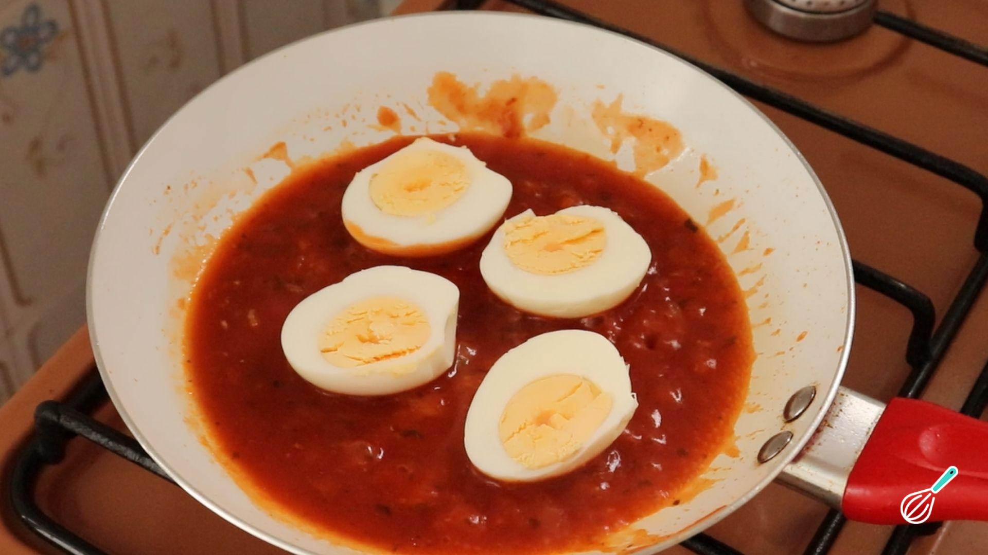 Coloque os ovos cozidos, misture e desligue o fogo.
