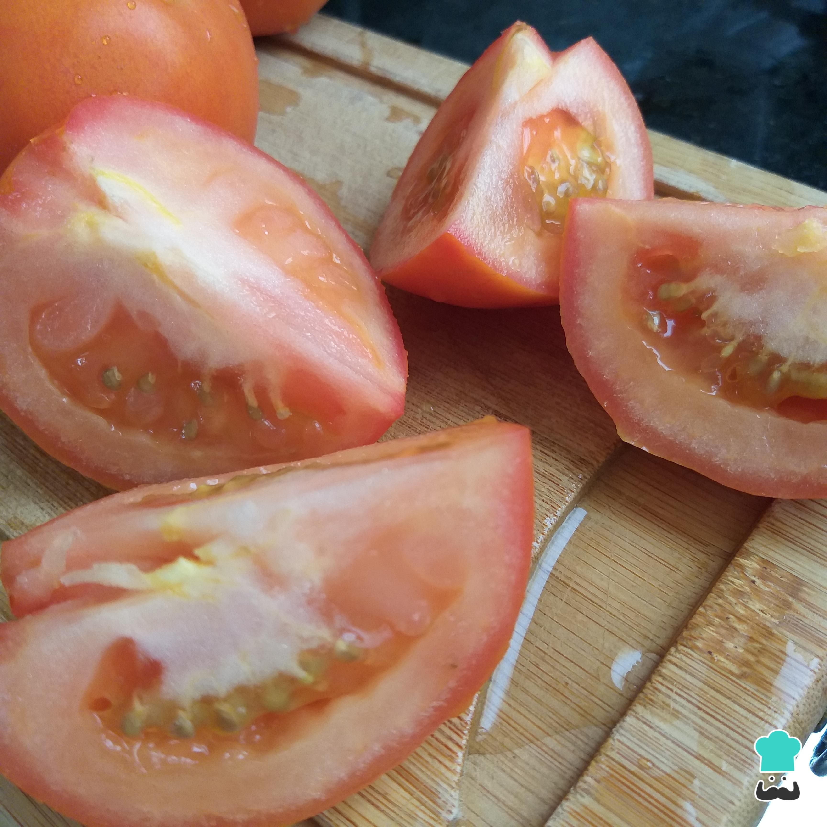 Para preparar seu extrato de tomate caseiro escolha tomates maduros e sem machucados. Em seguida corte todos os tomates em 4 partes, como na foto.