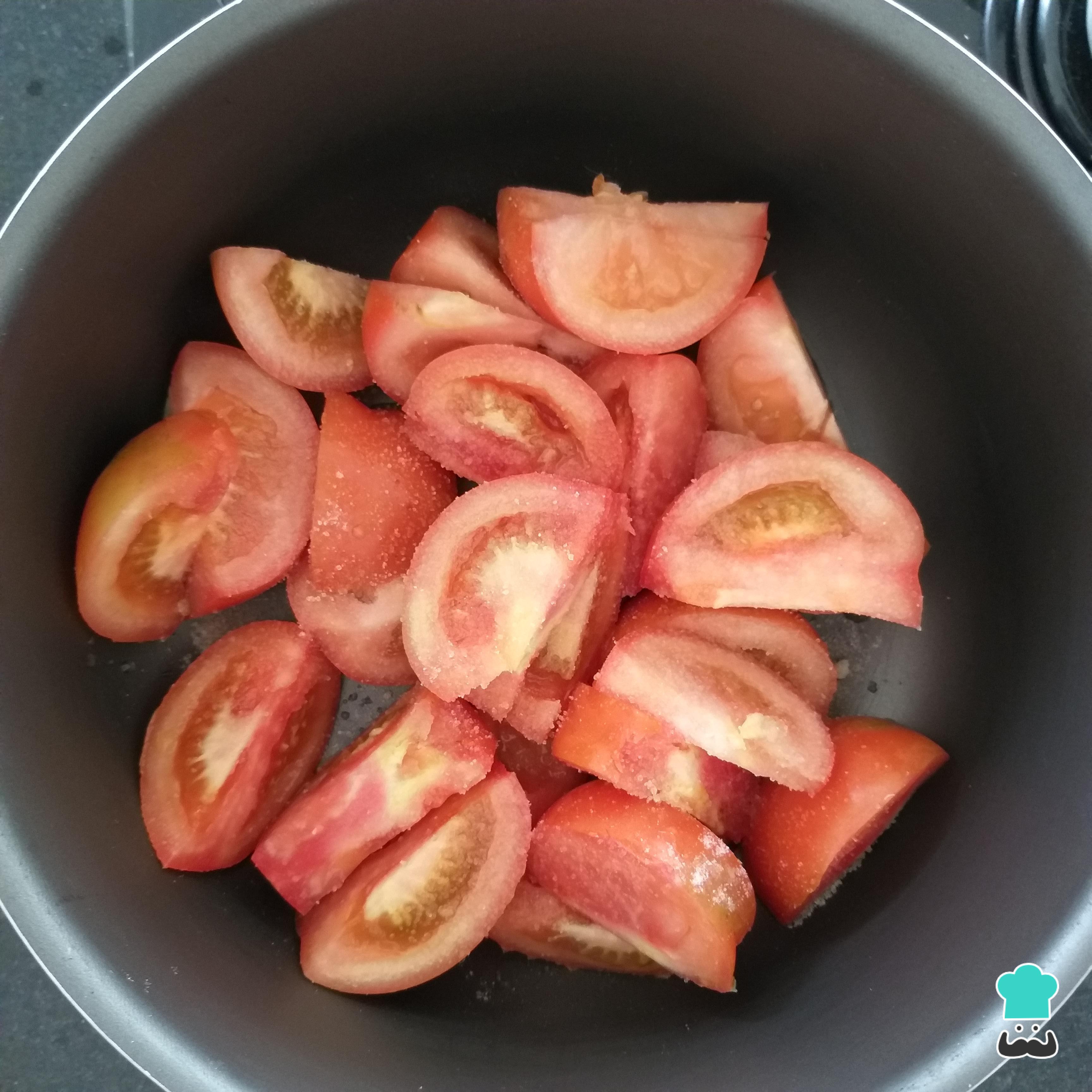 Leve uma panela ao fogo médio e acrescente os tomates, o açúcar e o sal. Mexa por 15 minutos ou até os tomates soltarem sua água e ficarem macios.
