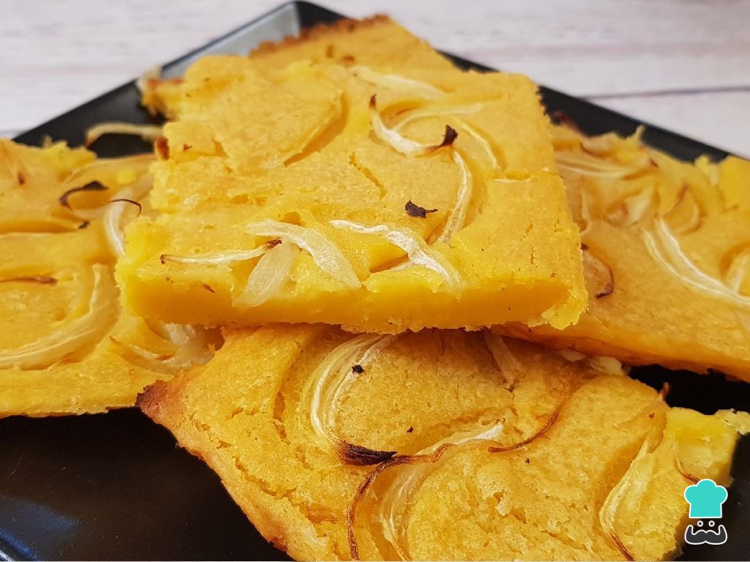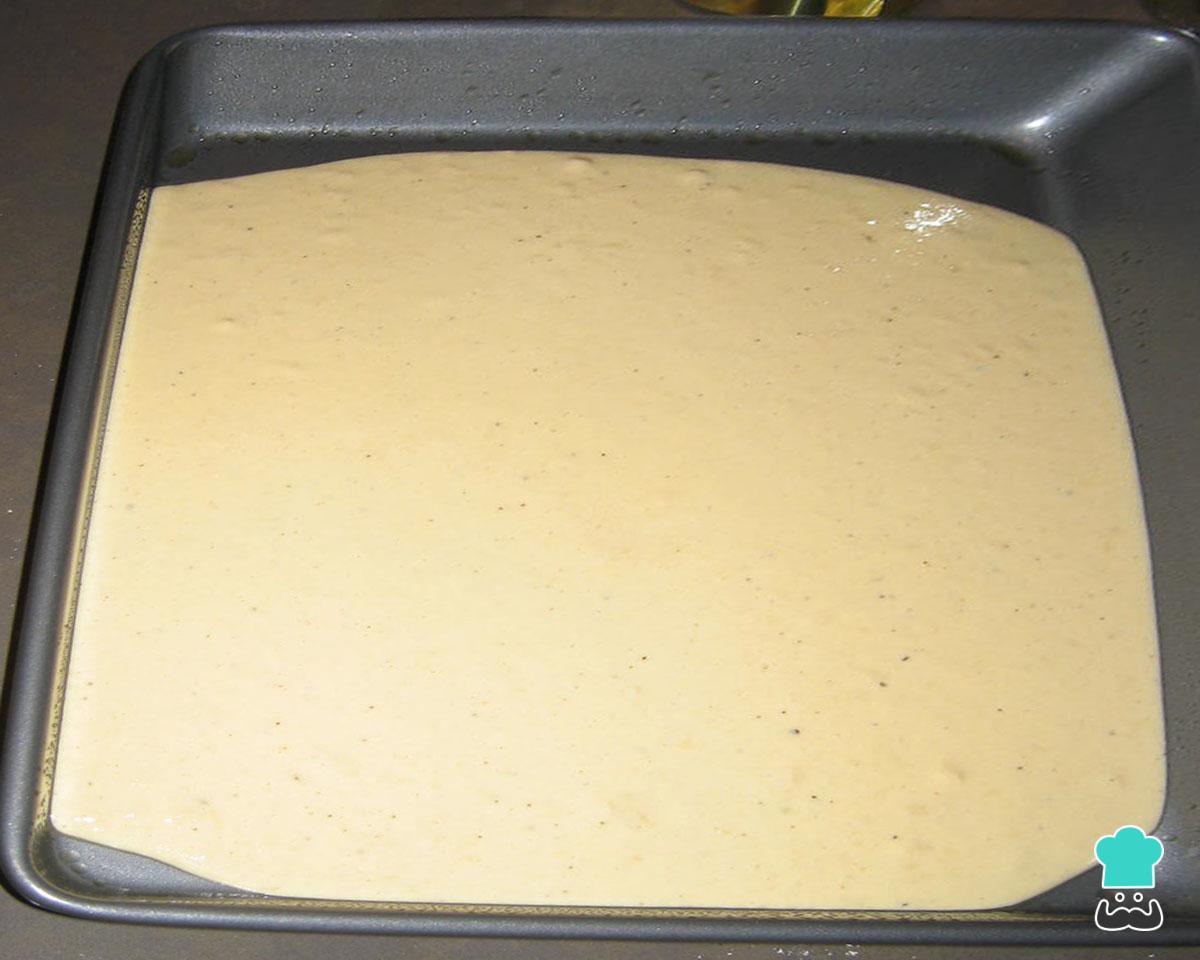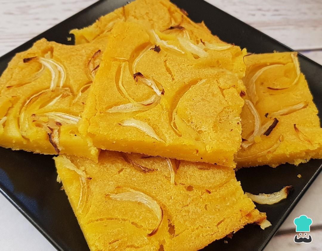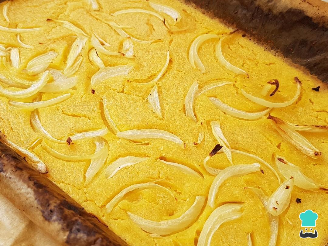 Despeje a massa na assadeira untada e decore com a cebola fatiada. Leve para assar no forno a 180-200 graus por 20 minutos ou até dourar.