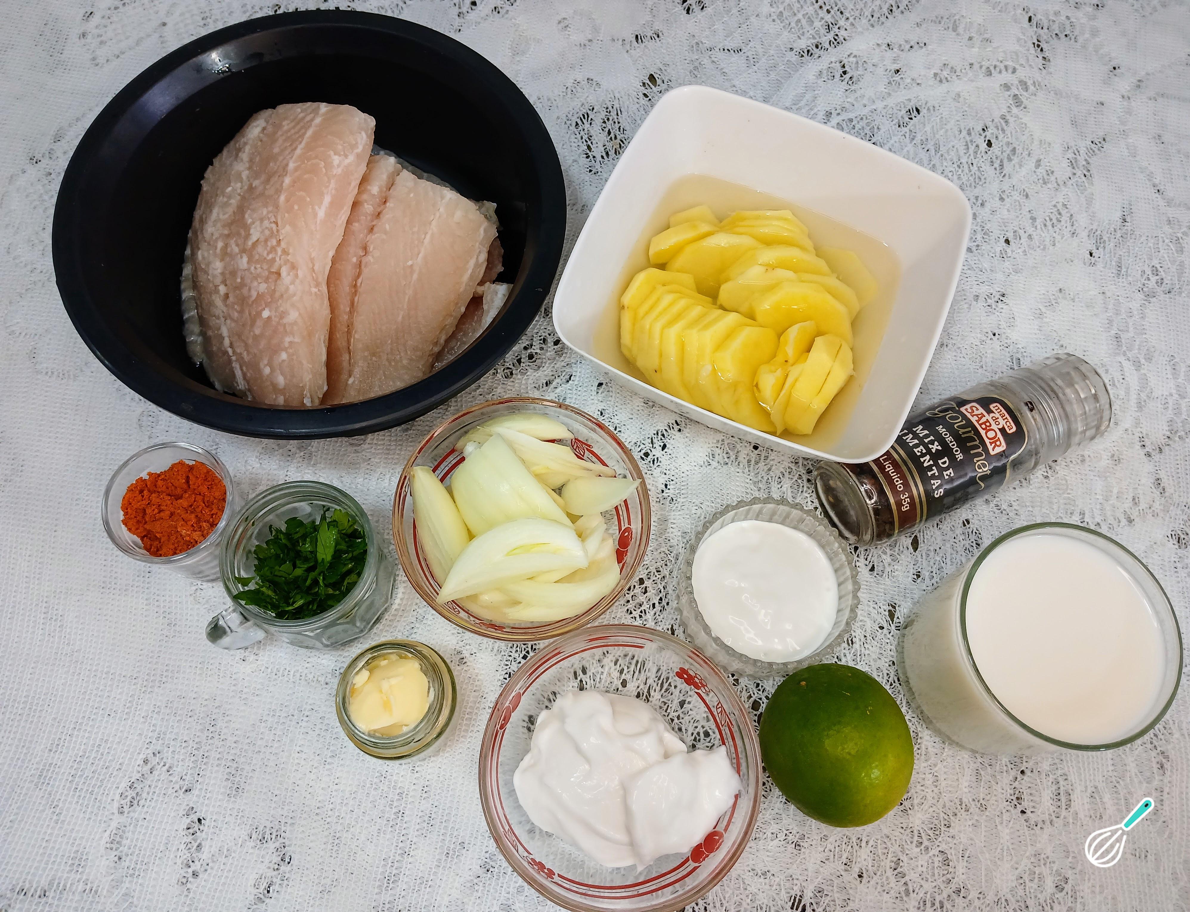 Comece separando os ingredientes para o preparo do falso bacalhau. Corte as batatas bem fininhas e as cebolas em formato juliene. Corte a cebolinha verde e salsinha também bem fininhas. Separe o requeijão, o creme de leite, o leite e os filés de peixe.