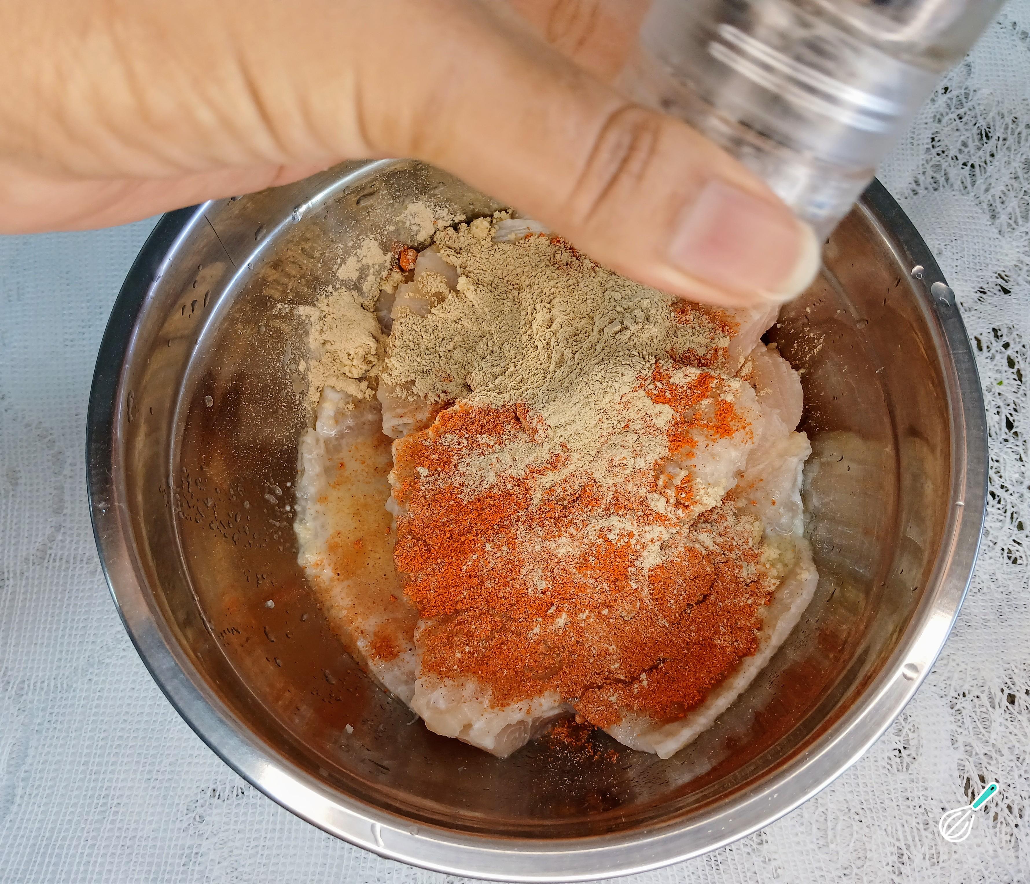 Feito isso, em um bowl coloque os filés de peixe. Corte o limão ao meio e esprema o suco, em seguida acrescente sal, pimenta, o alho e cebola em pó e também o cominho em pó. Misture bem com as mãos