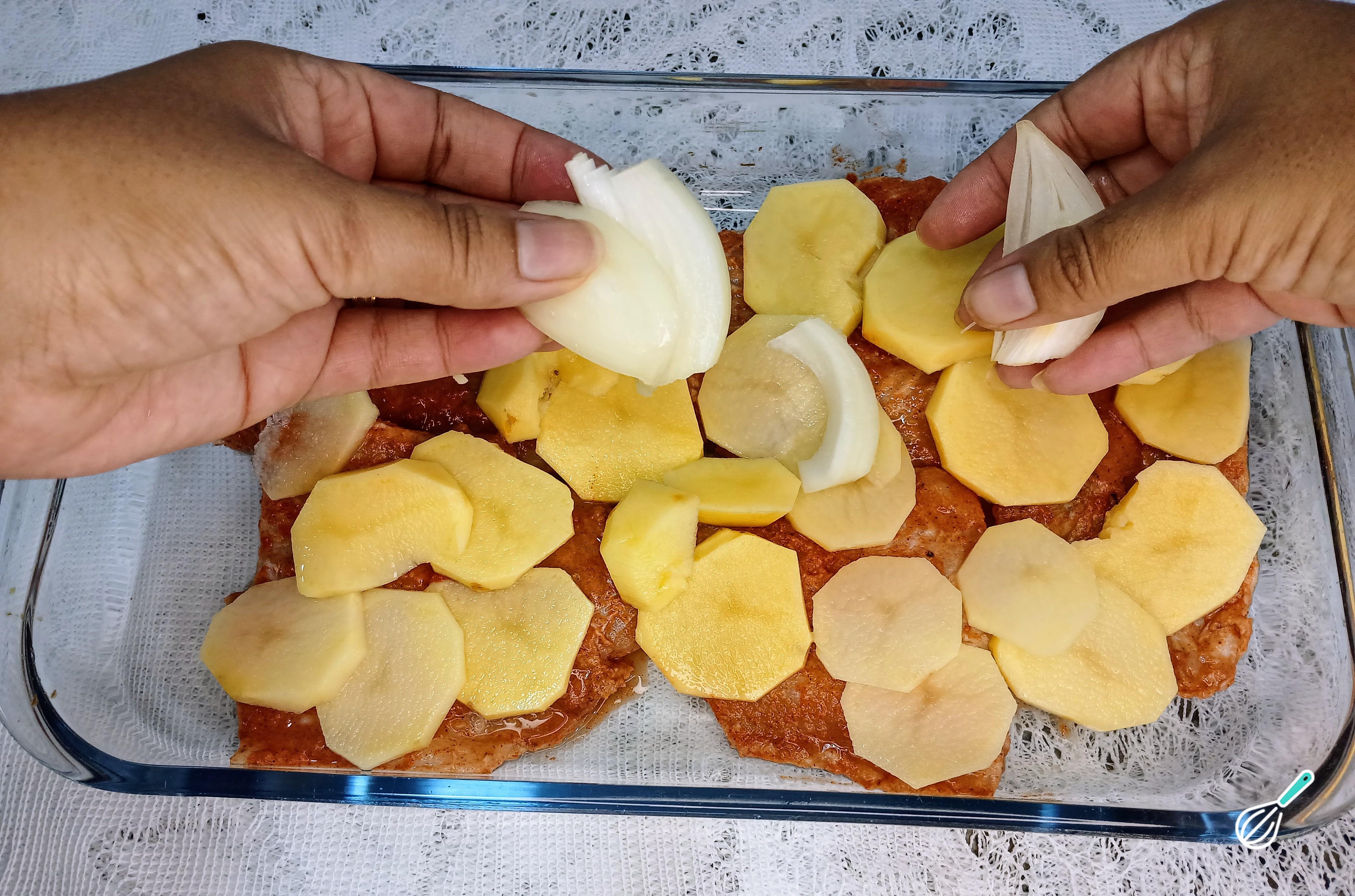 Feito isso, coloque os filés de peixe na travessa e, por cima, as batatas cortadas e a cebola. Cubra com um pano de prato e reserve.