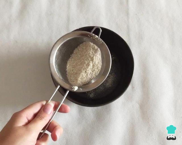 Em seguida passe a farinha de arroz por uma peneira, para filtrar os pedaços de arroz que restem. Devolva esses pedaços de arroz ao liquidificador e bata até virarem farinha.