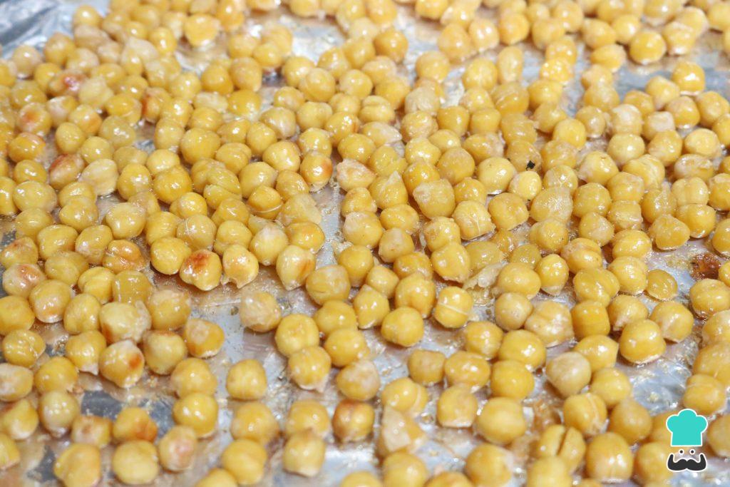 Após o tempo indicado escorra a água e lave o grão. Coloque-o em um pano de cozinha e seque levemente, para eliminar o excesso de água. Coloque em um tabuleiro de forno e leve a assar a 180ºC durante 40 minutos.
