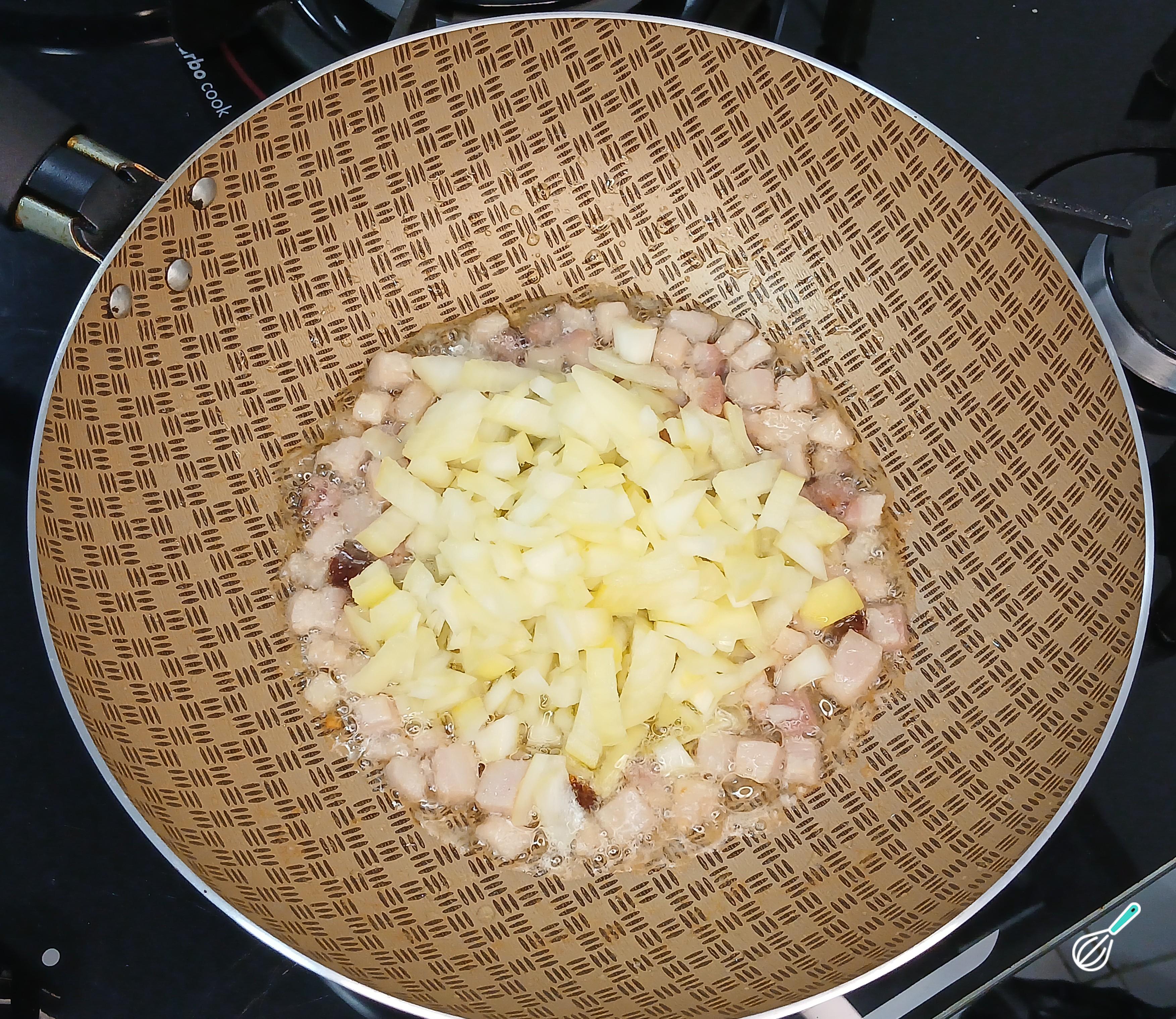 Assim que o bacon estiver frito, adicione a cebola branca para fritar e o alho em pó. Mexa bem e deixe que cebola refogue, sempre em fogo baixo para evitar que queime.