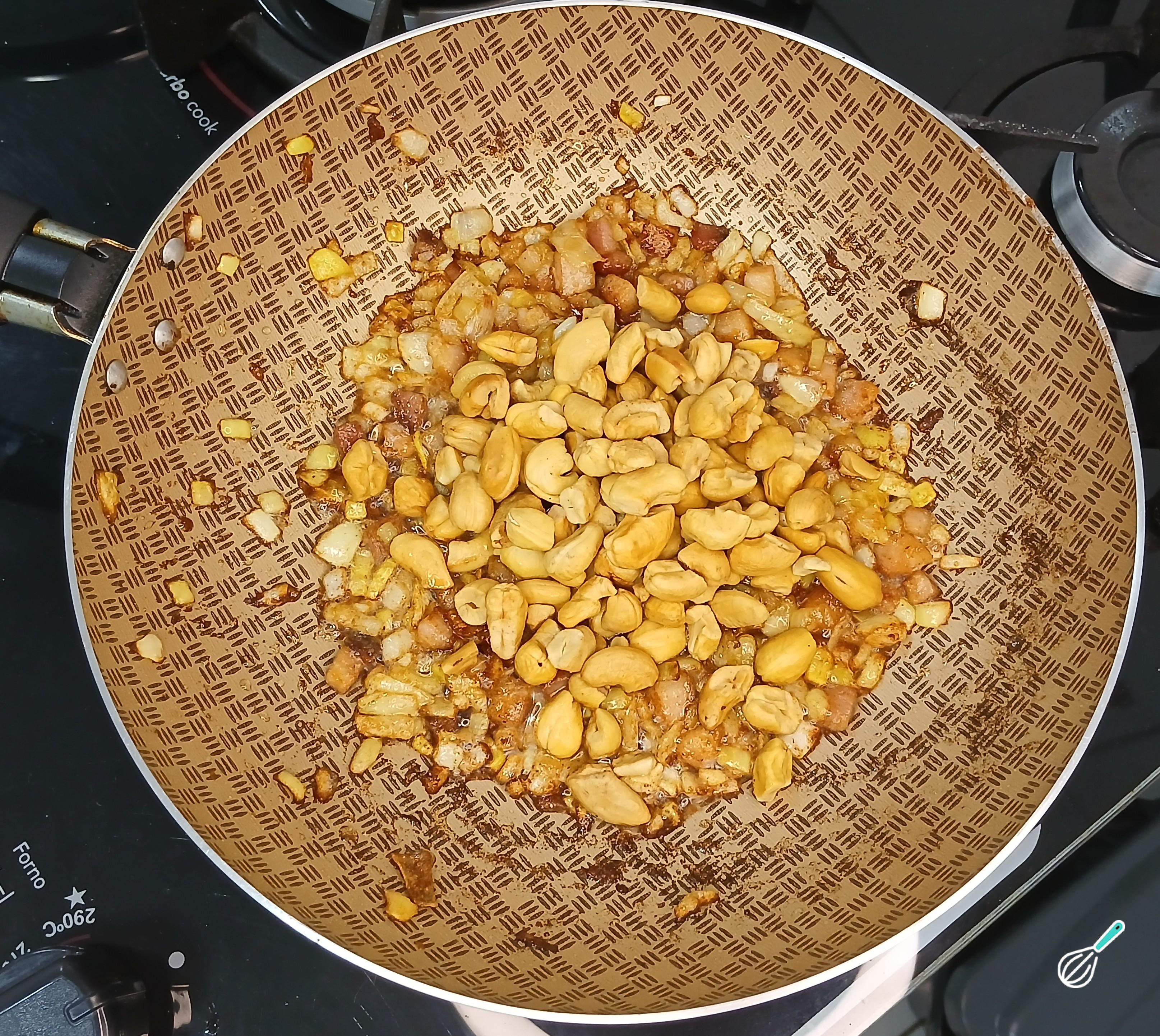 Depois de refogar a cebola e o bacon, acrescente a castanha de caju picada e refogue um pouco. Adicione um pouco de sal e deixe que os sabores e os temperos incorporem, mexa bem e cuidado para não queimar!