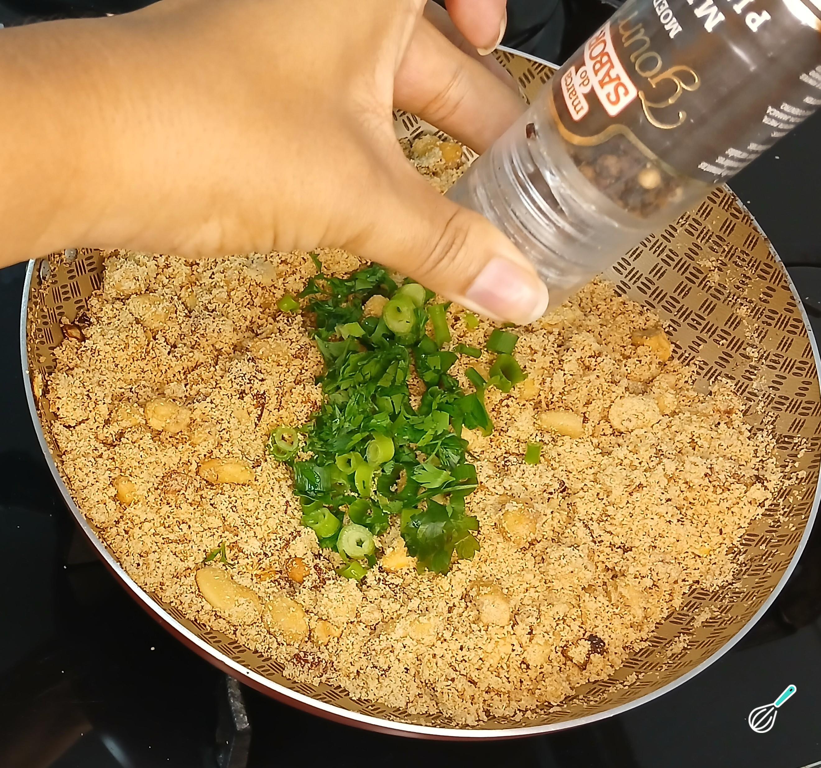 Por último, adicione a farinha de mandioca que pode ser a crua ou torrada, pois não altera o resultado final ou o sabor da receita. Adicione a pimenta moída, a cebolinha verde e a salsinha. Misture tudo muito bem e sempre mantenha o fogo baixo para não queimar a farofa, assim que estiver pronta, desligue.