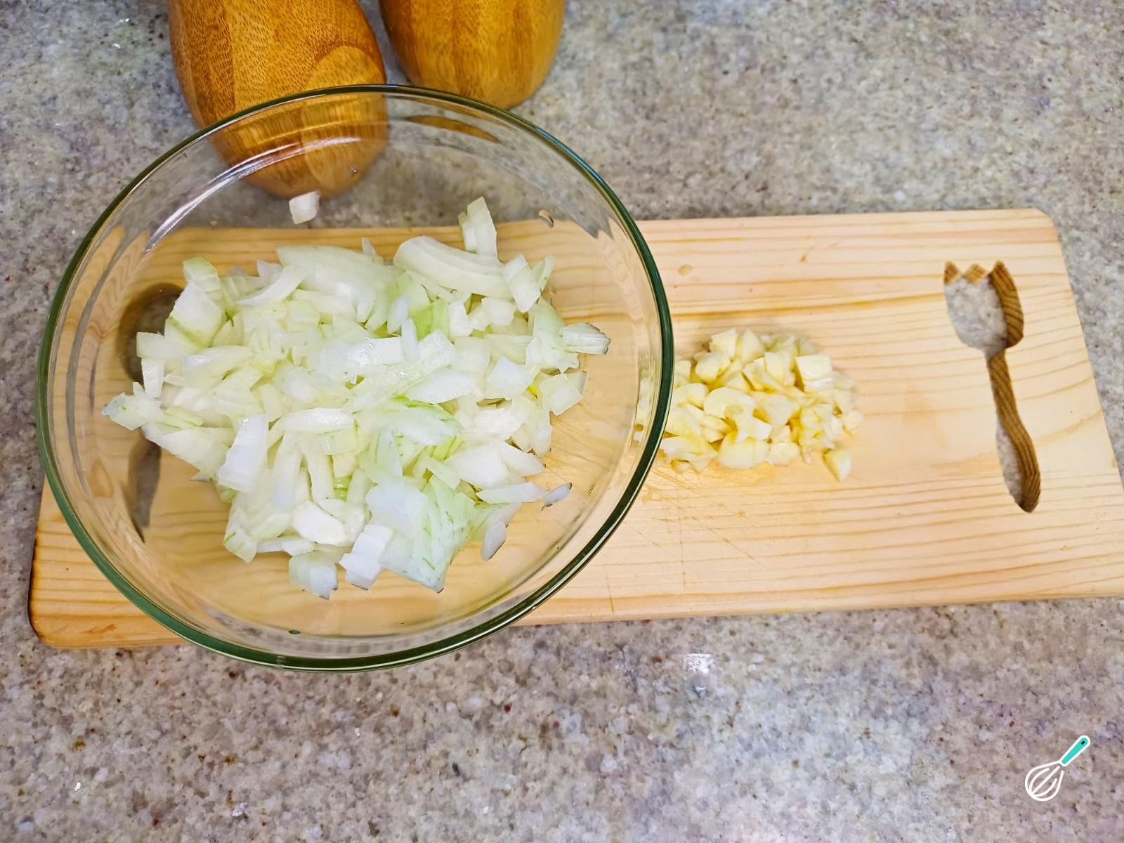 Comece picando a cebola em cubos pequenos. Amasse e pique bem os dentes de alho.