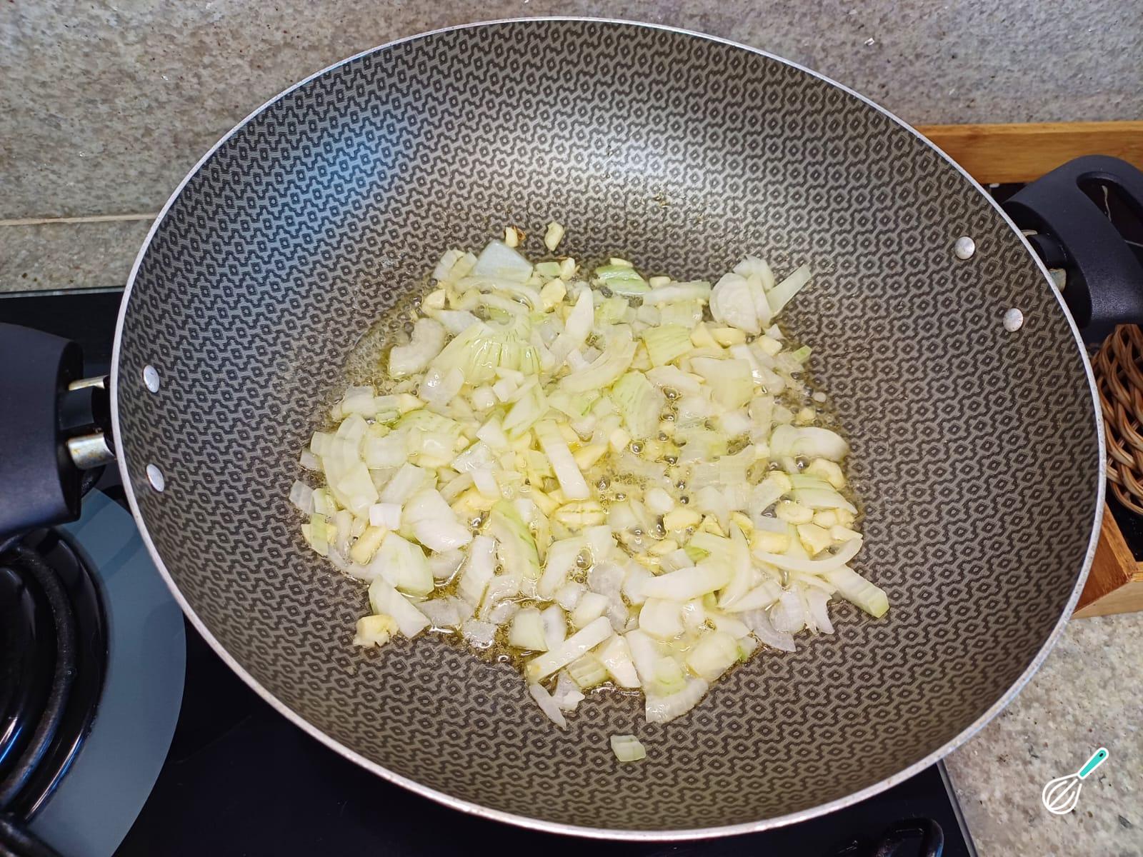 Adicione a cebola picada e refogue até que ela comece ficar transparente e levemente dourada. Acrescente o alho e refogue por mais um minuto, mexendo sempre até que o alho também esteja dourado.