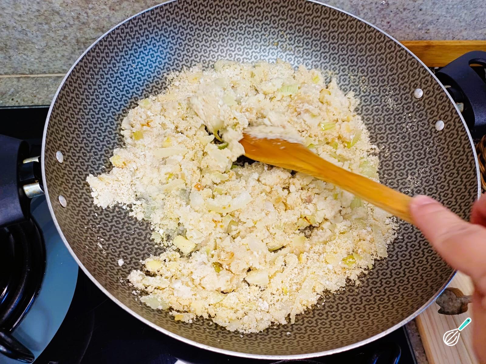 Com a cebola e o alho refogados, adicione a farinha de mandioca , mexendo para que a farinha absorva a manteiga e os sabores do refogado.