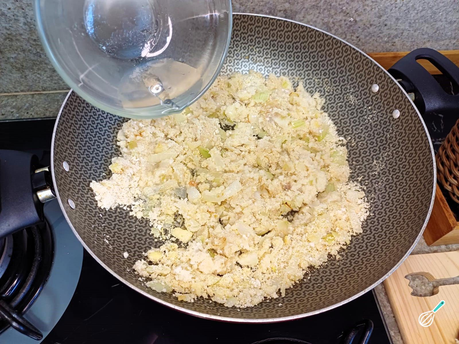 A quantidade da água pode variar dependendo da farinha, então adicione água até que a farofa fique levemente úmida, mas ainda soltinha.
