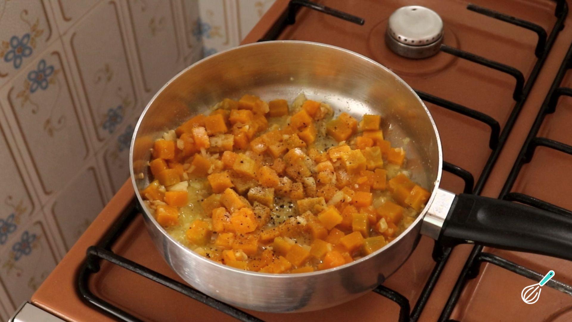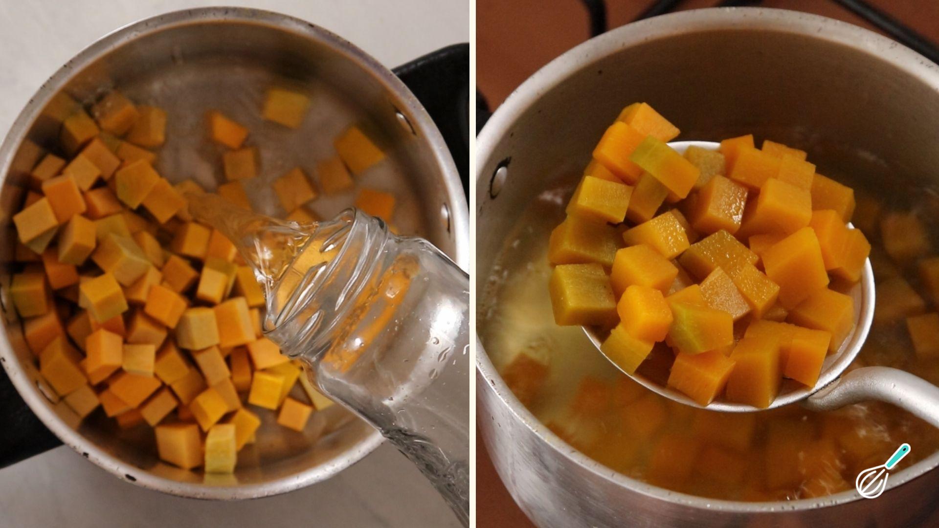 Comece descascando e cortando a abóbora em cubos pequenos. Coloque em uma panela, cubra com água e cozinhe até ficar al-dente. Escorra a água e reserve.