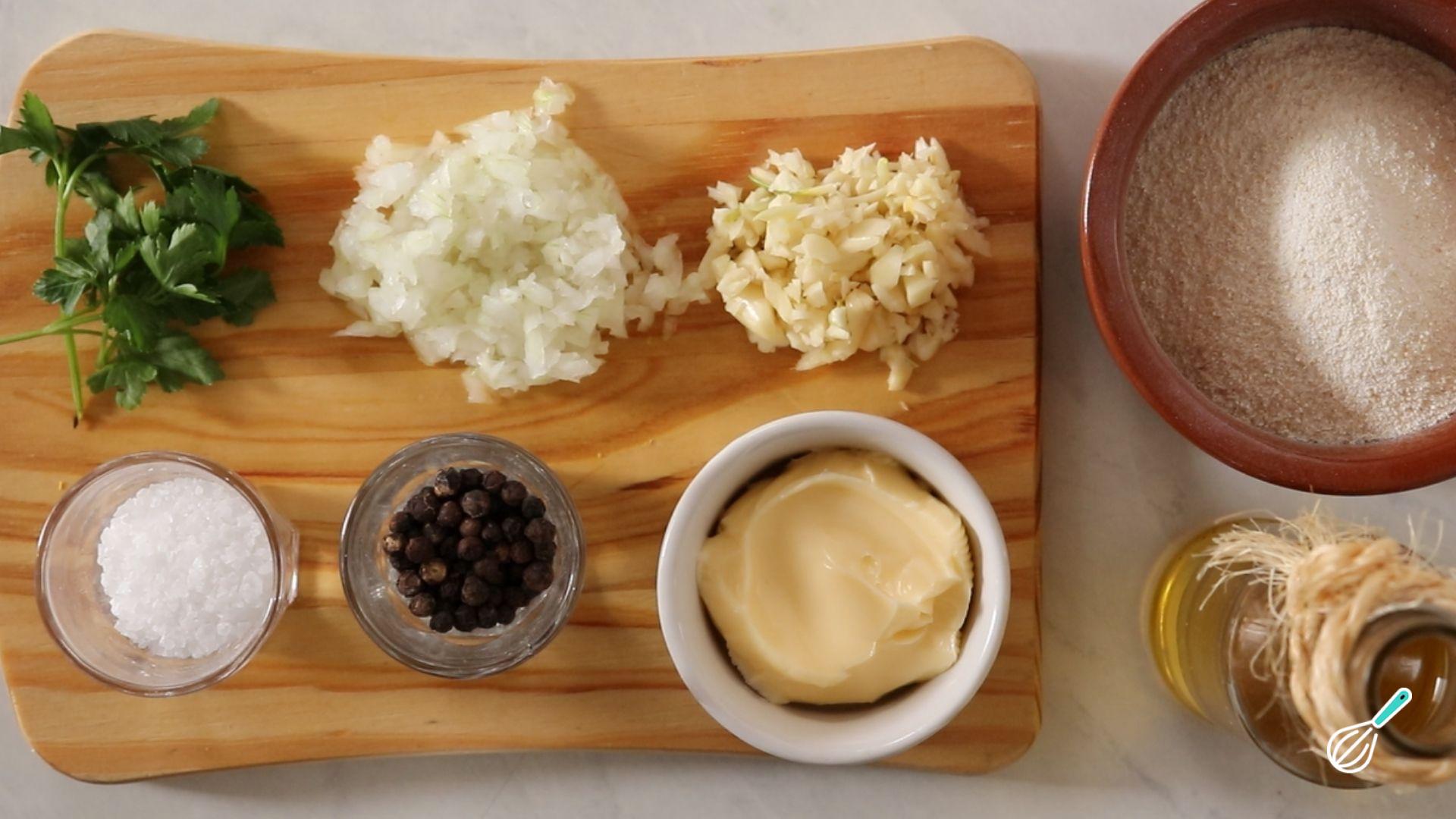 Separe os demais ingredientes para a farofa de abóbora: pique o alho, a cebola e a salsinha.