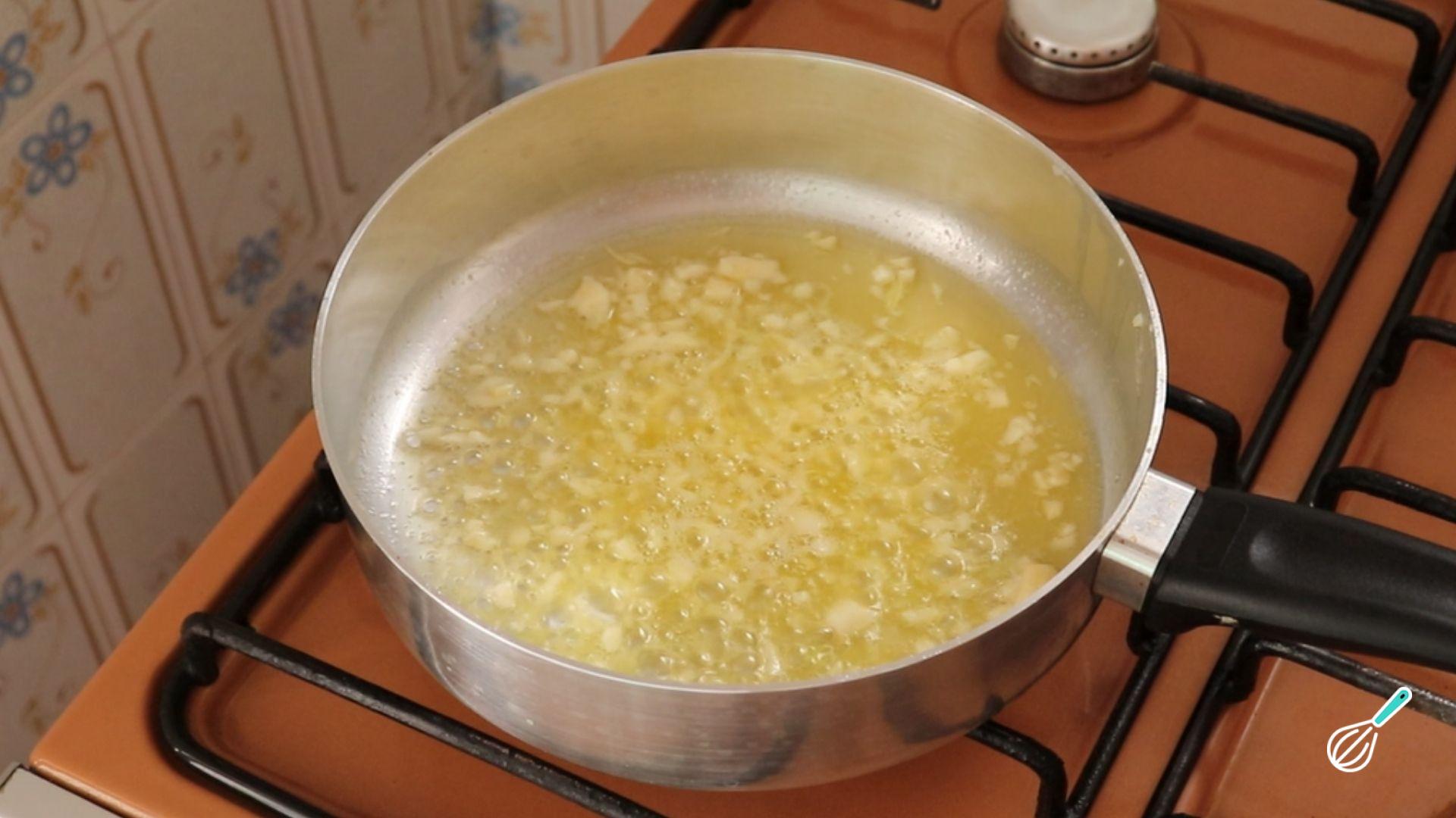 Leve uma panela ao fogo médio, derreta a manteiga com o azeite e frite o alho. Em seguida junte a cebola e doure.