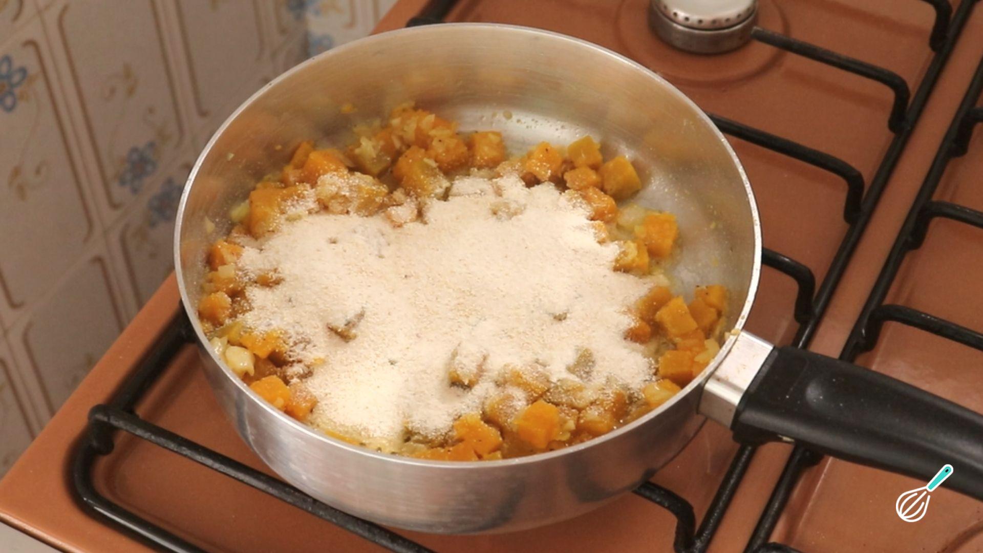 Coloque a abóbora cozida e escorrida, tempere com sal e pimenta e mexa bem para pegar o sabor do refogado.