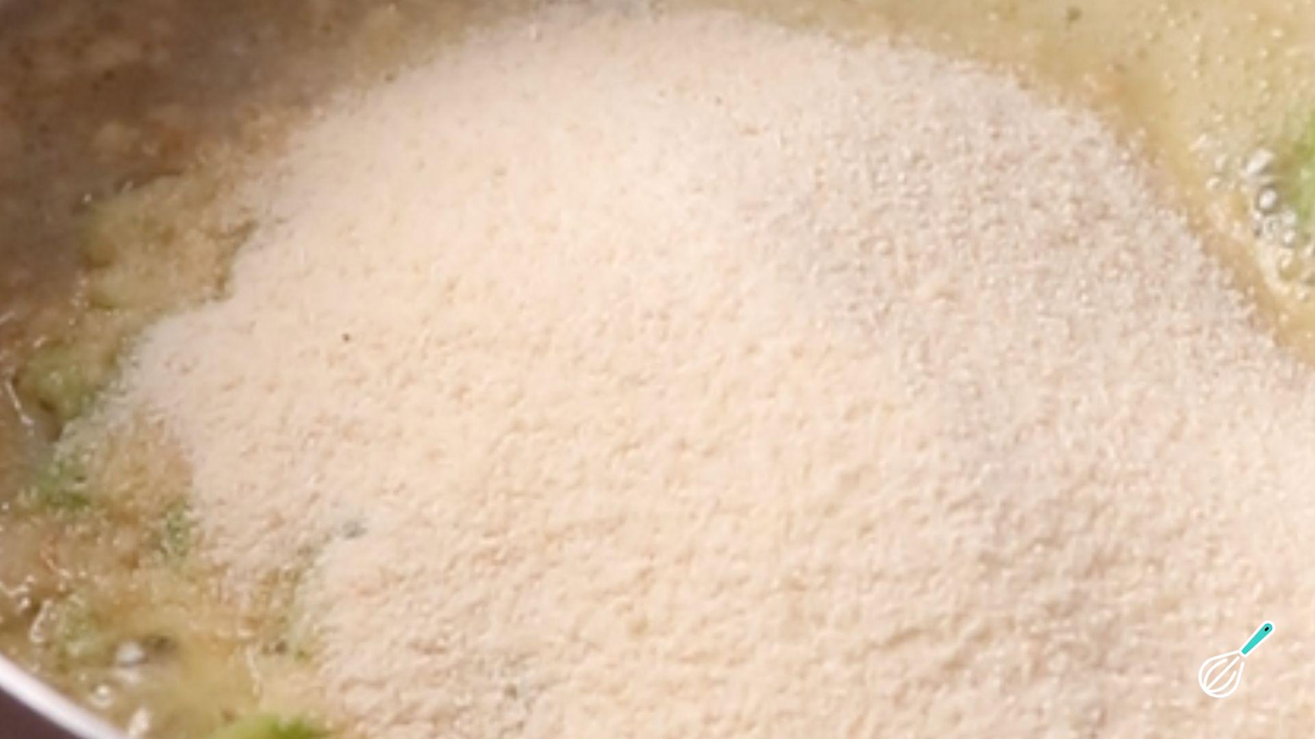 Assim que o alho dourar acrescente a farinha e mexa bem para que ela fique bem úmida pela manteiga derretida.
