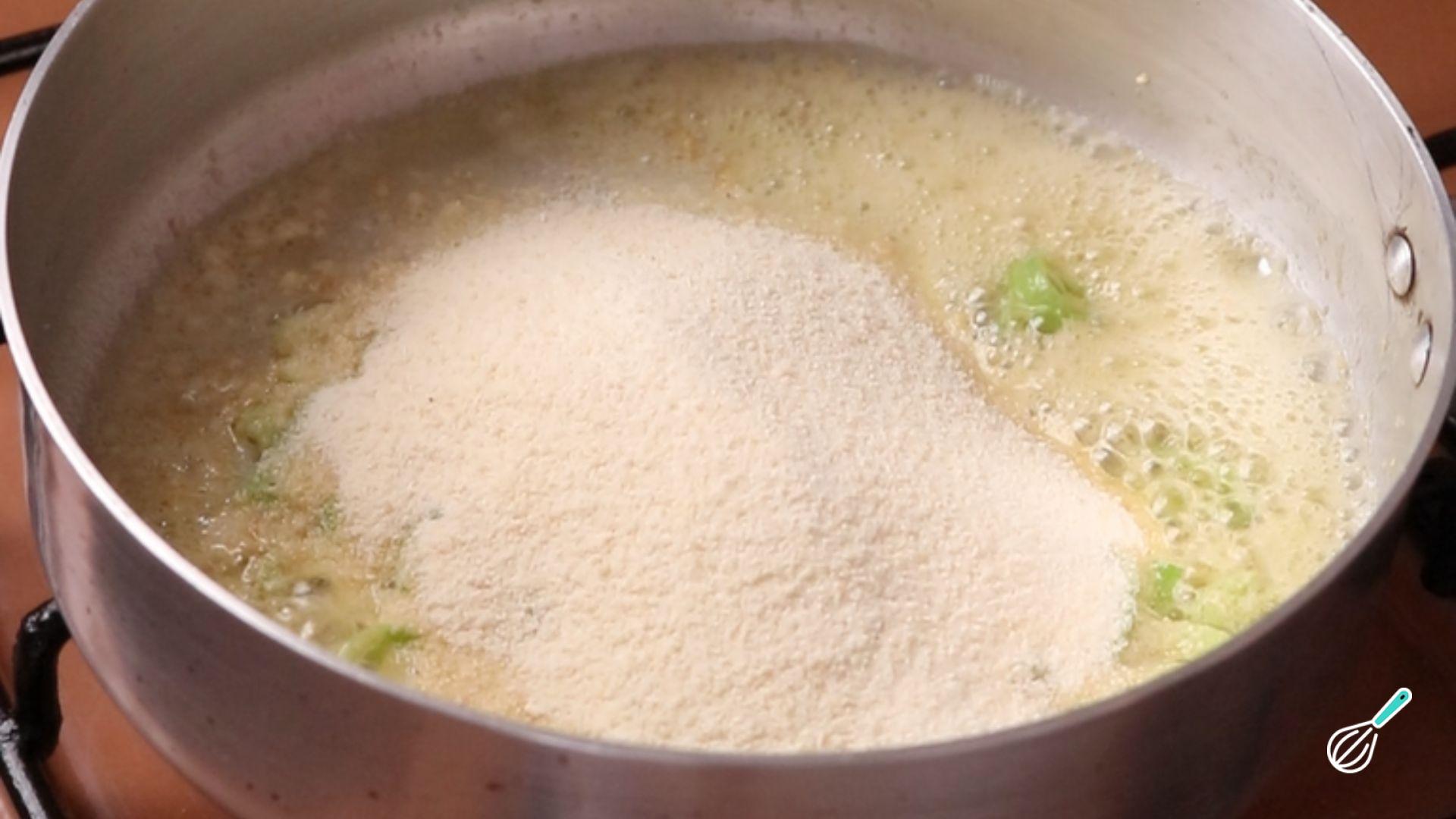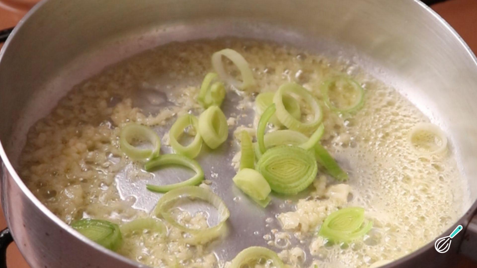 Depois coloque a manteiga e o azeite em uma frigideira e, quando a manteiga derreter, doure o alho picado e em seguida junte o alho-poró e refogue.