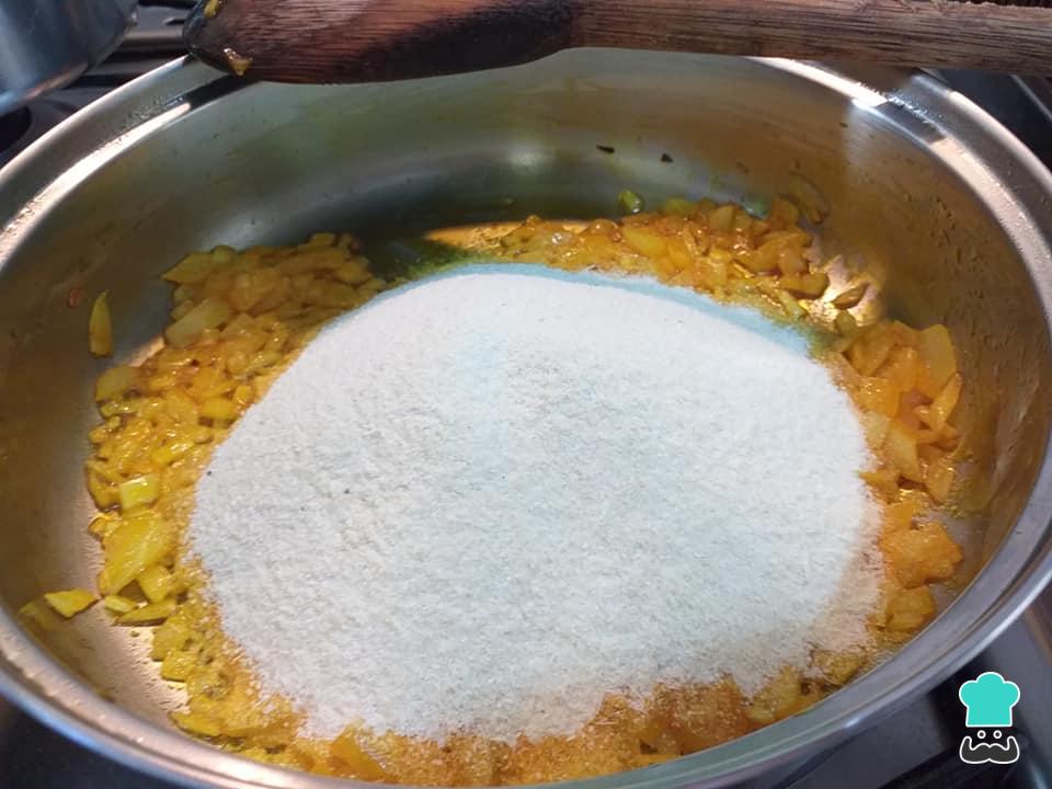 Aqueça o azeite de dendê no fogo médio. Adicione a cebola picada e deixe refogando por uns 4 minutos.