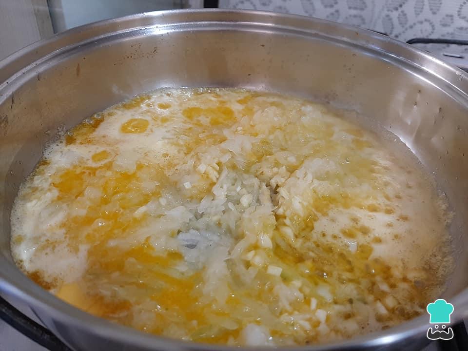 Numa frigideira média, aqueça a manteiga e refogue a cebola ralada e o alho picado por 2 minutos.