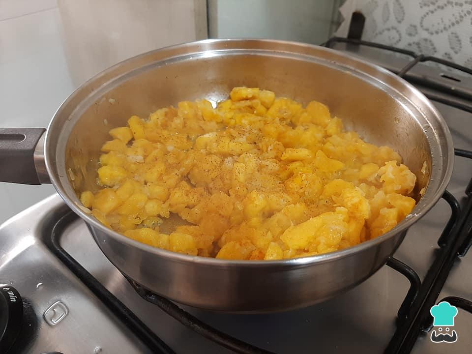 Adicione a banana da terra crua e cortada em cubinhos e deixe refogando, virando de vez em quando com cuidado, por 3 minutos ou até dourar levemente. Tempere com sal, pimenta do reino e açafrão.