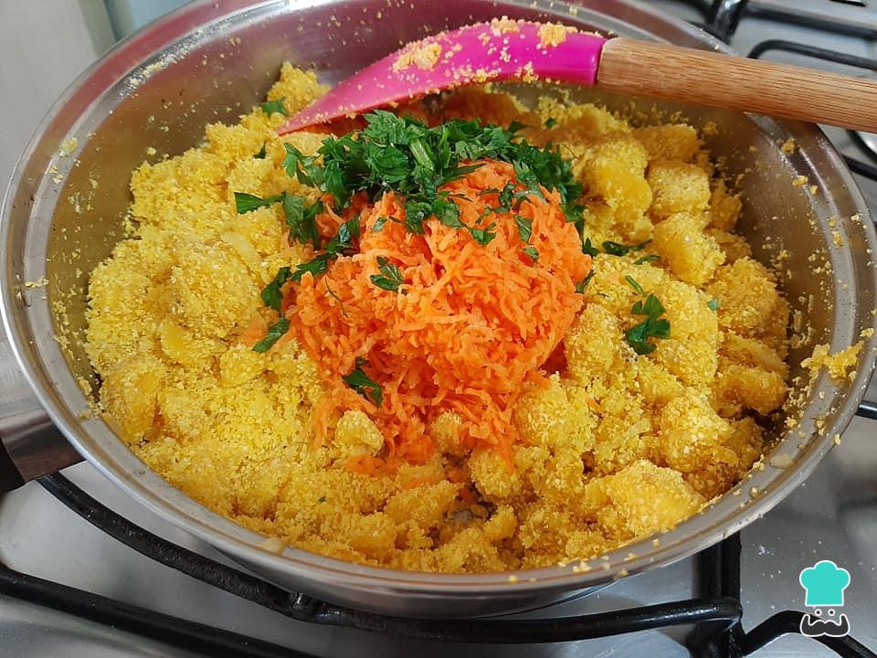 Adicione a farinha de milho, a cenoura ralada e o cheiro verde picado, misturando delicadamente.