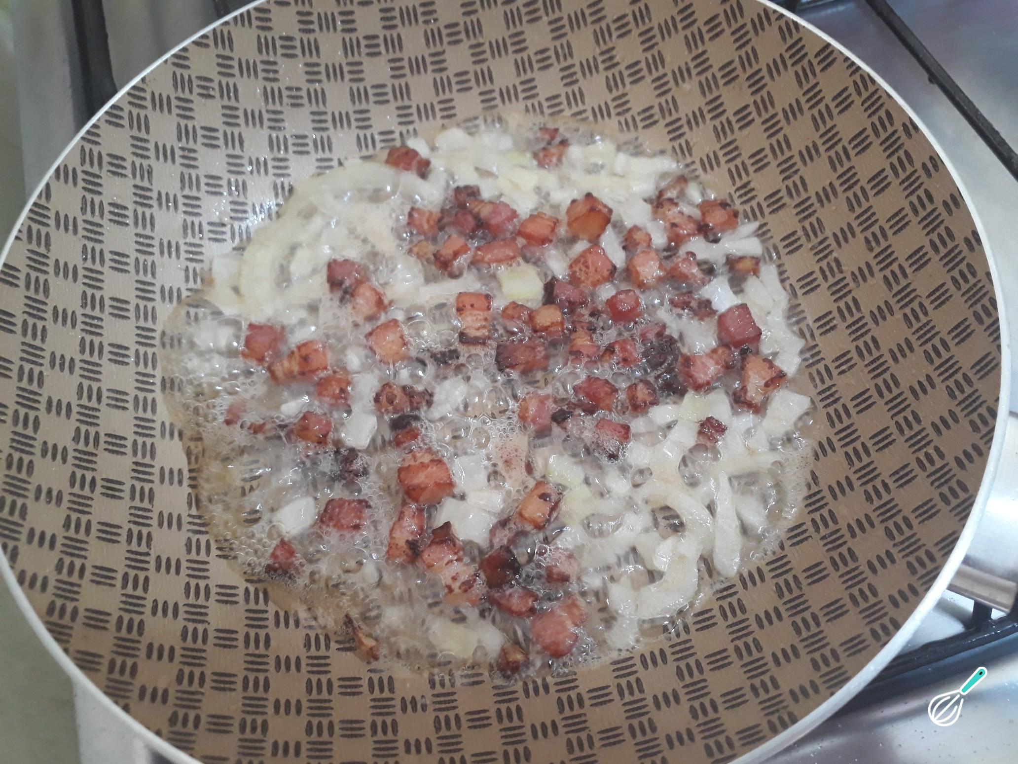 Primeiramente frite o bacon com o azeite até dourar. Adicione a cebola picada e refogue até murchar bem.