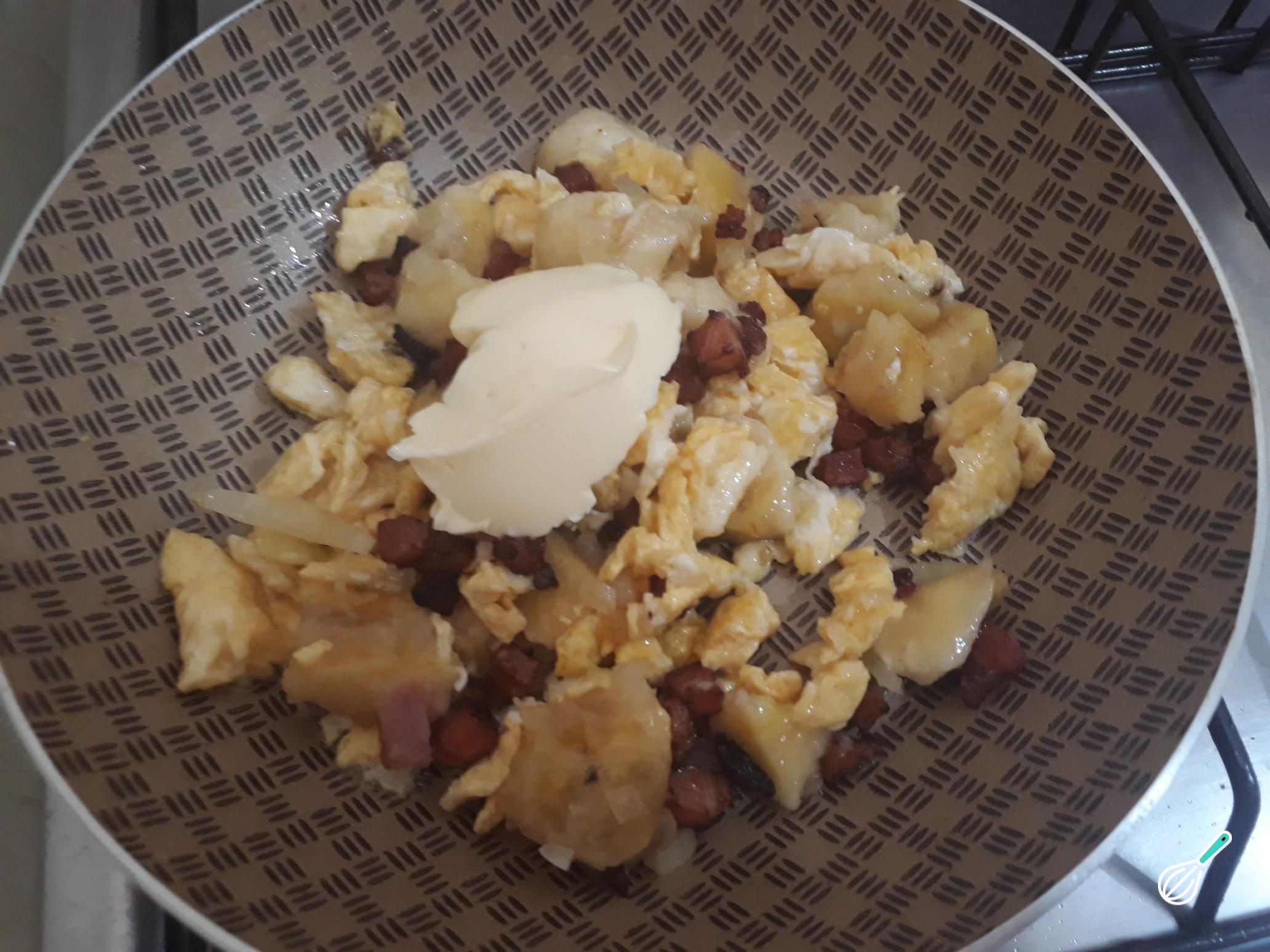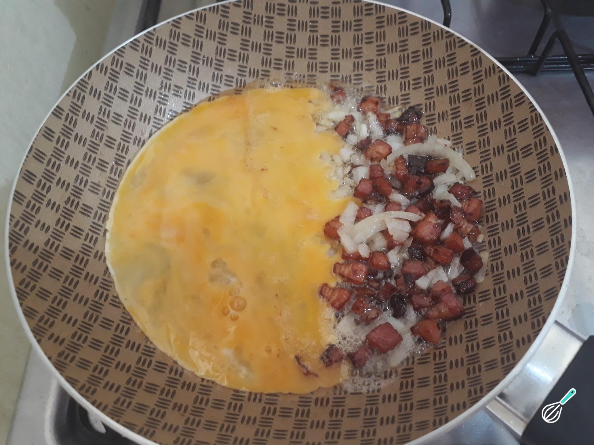 Baixe o fogo e afaste para o bacon e a cebola fritos para uma das metades da frigideira. Adicione os ovos levemente batidos na outra metade da frigideira e vá mexendo os ovos até que estejam cozidos.