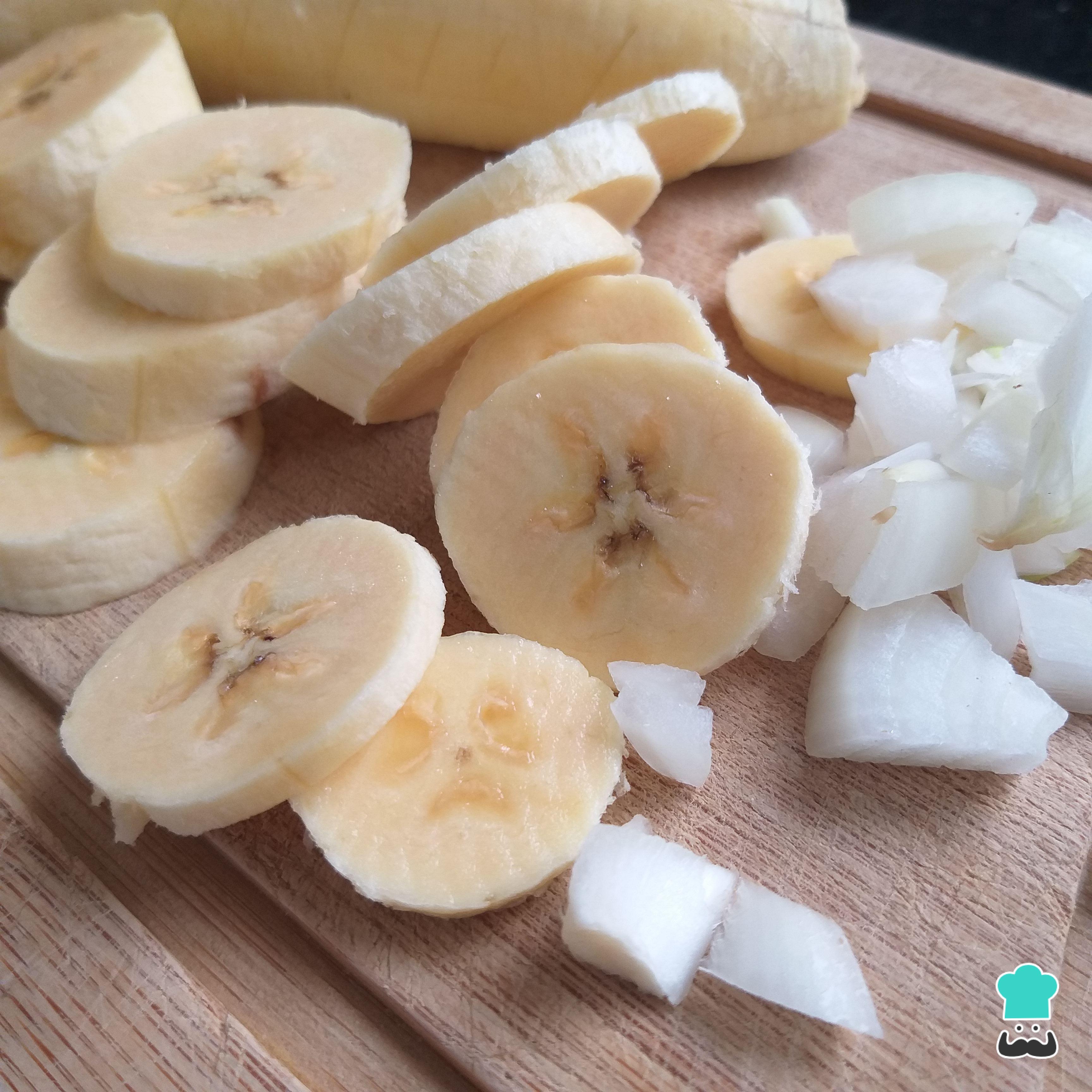 Corte as bananas em rodelas finas e a cebola em cubos pequenos.