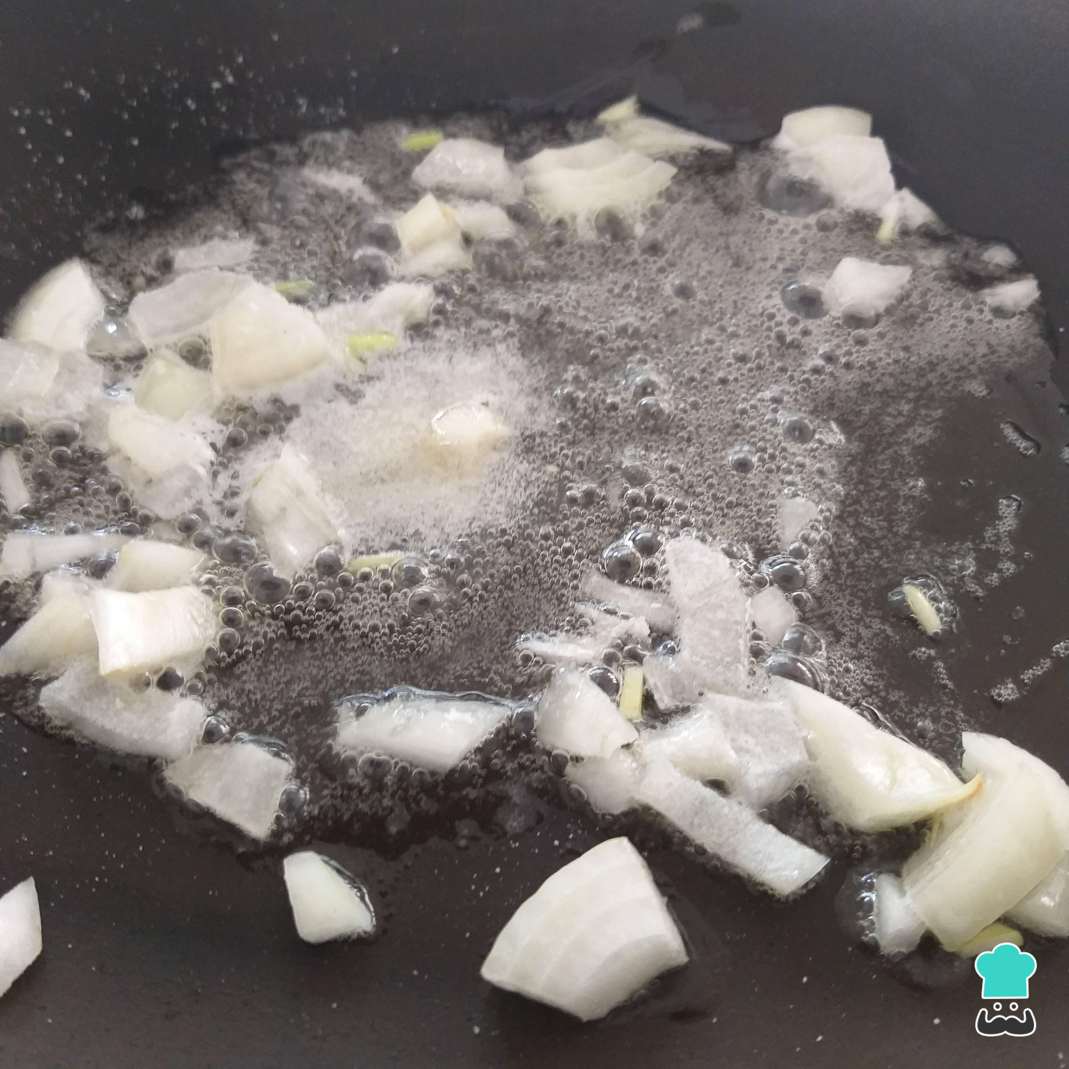 Leve uma panela ao fogo baixo, coloque metade da manteiga e o azeite. Espere esquentar, adicione a cebola e mexa bem até a cebola dourar.