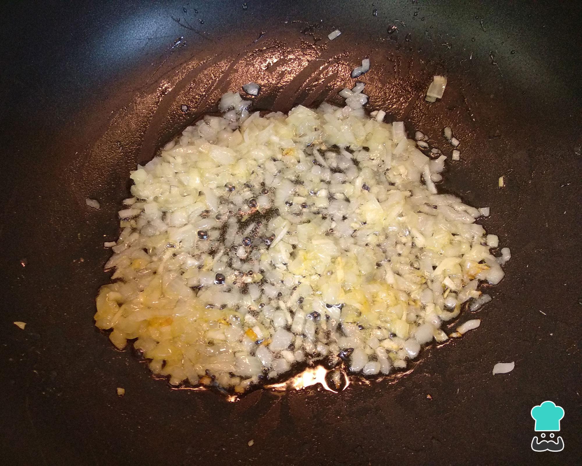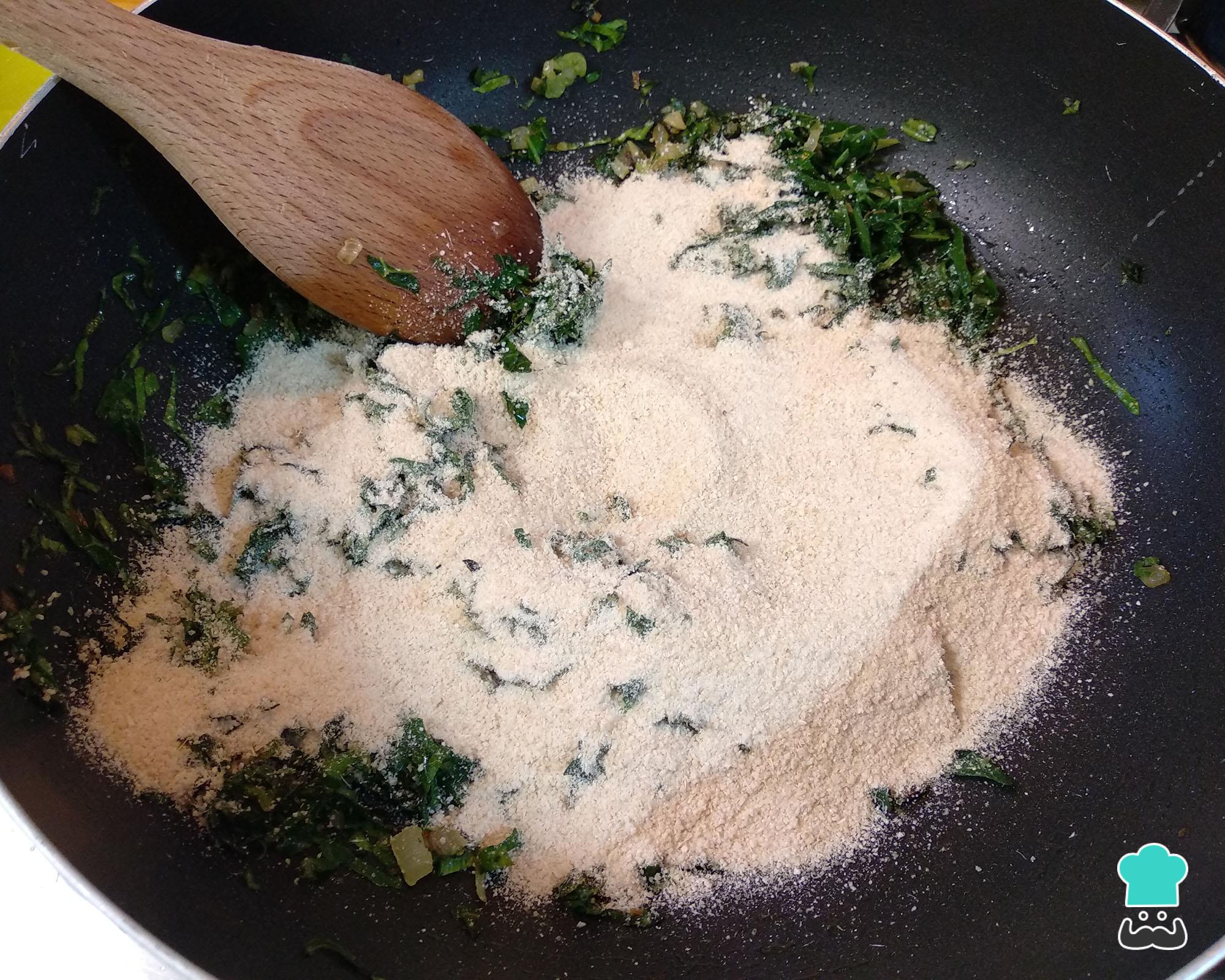 Preparar farofa de couve é muito simples! Em primeiro lugar leve ao fogo médio-baixo uma frigideira funda ou panela com o azeite ou óleo e refogue a cebola e os alhos até começar dourando.