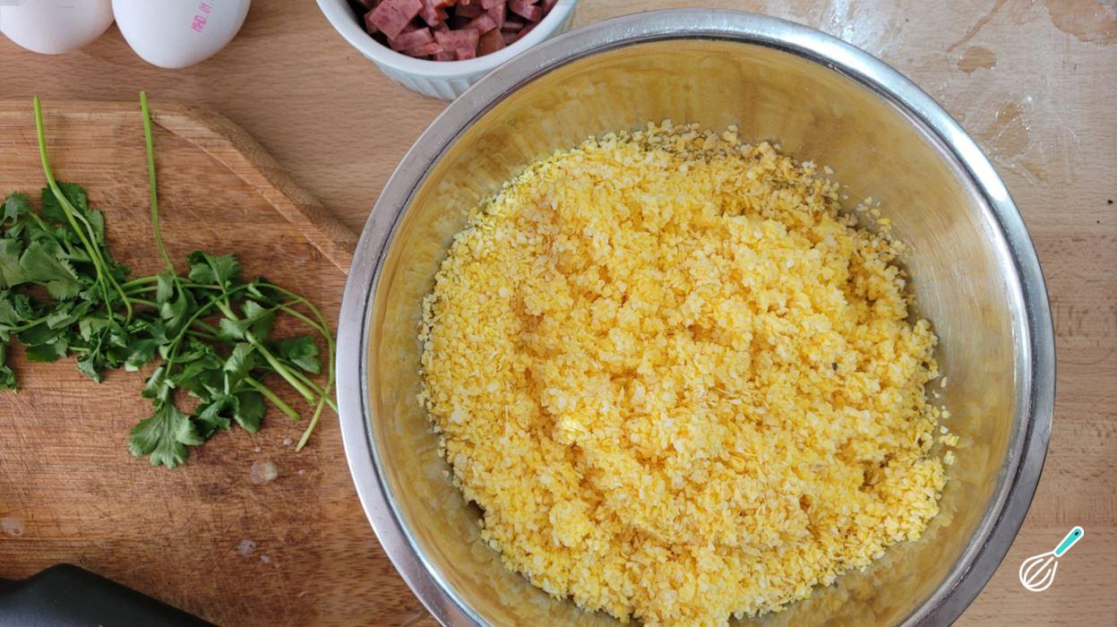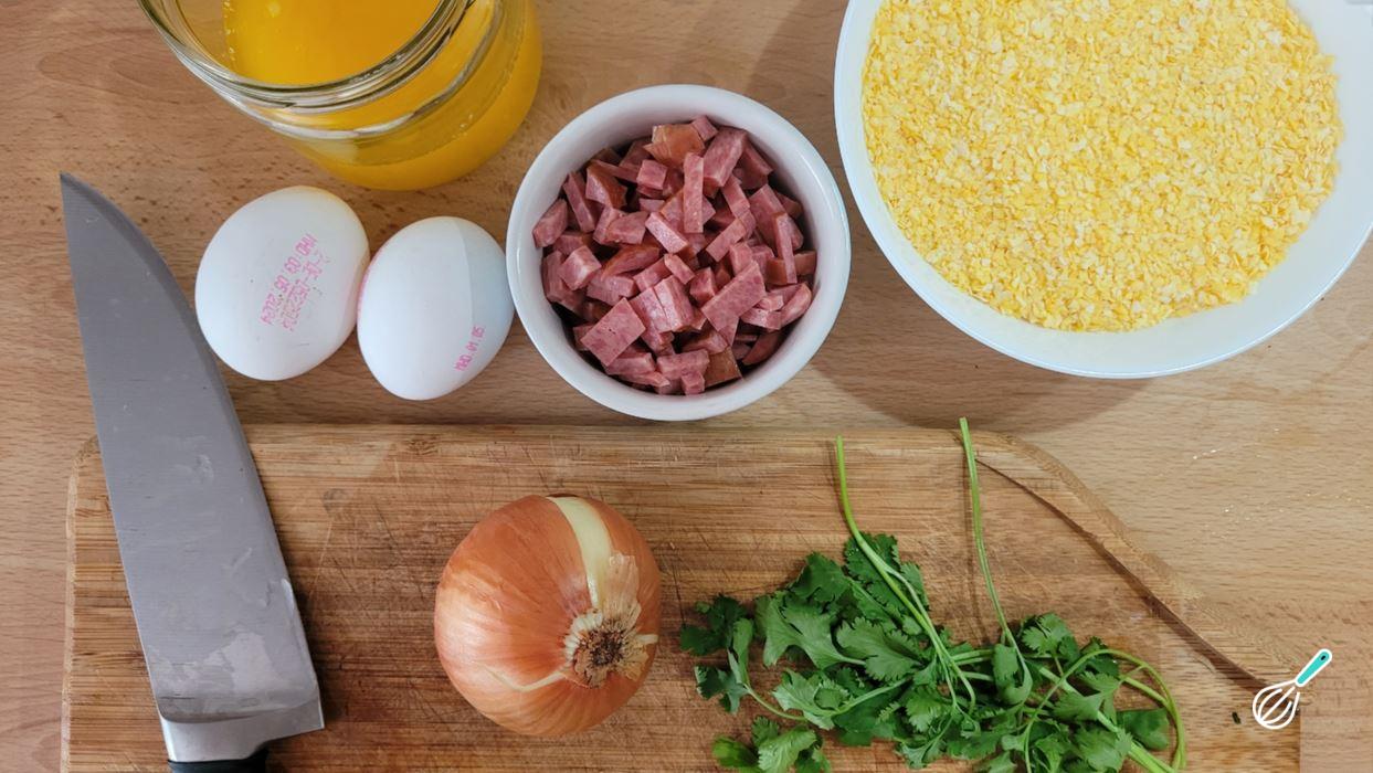 Separe os ingredientes para fazer a farofa de cuscuz com bacon.