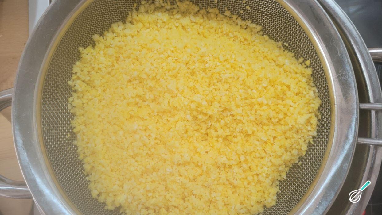 Quando o cuscuz tiver hidratado, dê uma leve afofada com um garfo e transfira para a peneira, sem compactar.