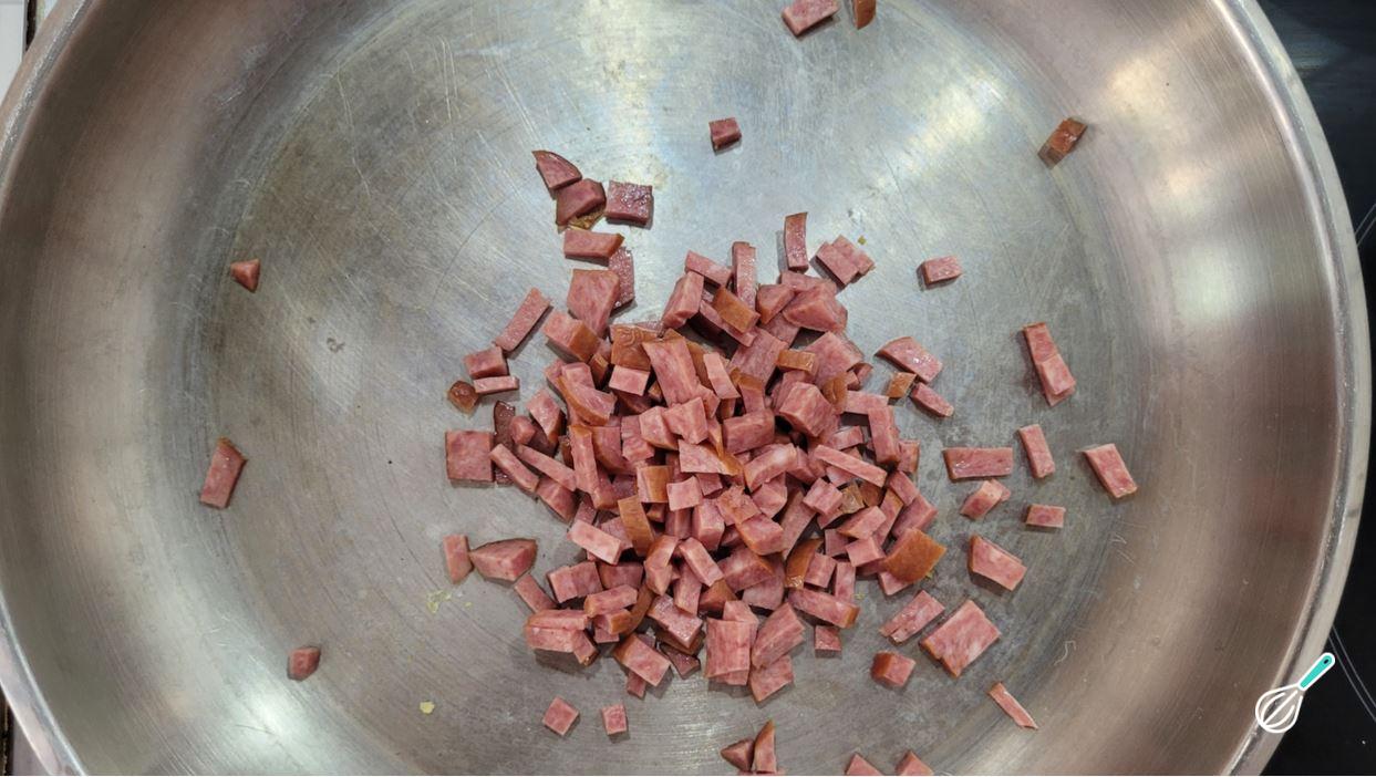 Quando o cuscuz estiver cozido, podemos começar o preparo da farofa. Comece colocando o bacon em cubinhos em uma frigideira antiaderente. Não é necessário colocar nenhuma gordura, o próprio bacon vai soltar a sua gordura.
