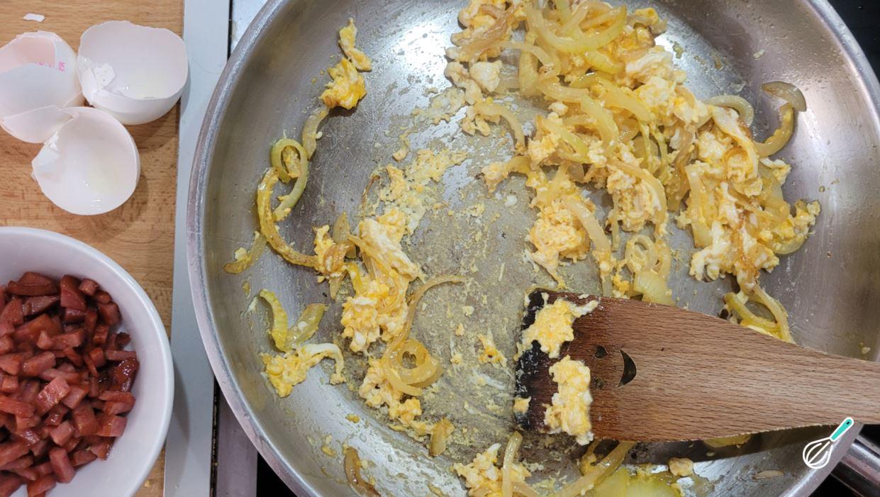 Deixe dourar e adicione os ovos, mexendo para misturar as claras e as gemas e fazer um ovo mexido.