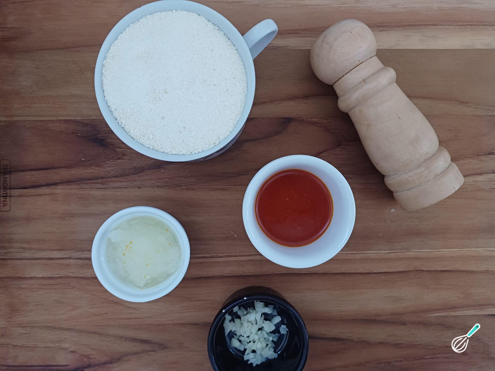 Separe todos os ingredientes necessários para preparar a receita de farofa de dendê.
