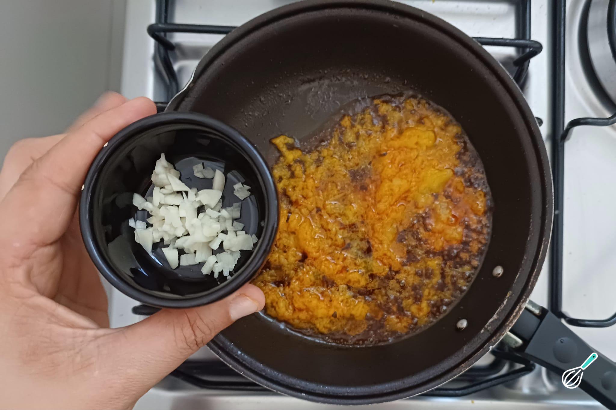 Numa panela ou frigideira, em fogo baixo, aqueça o azeite de dendê e refogue a cebola ralada.