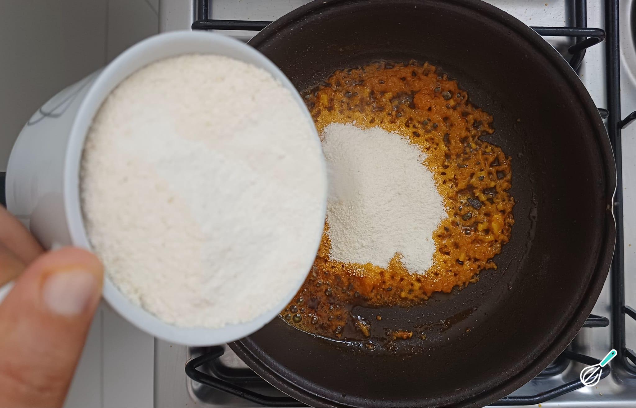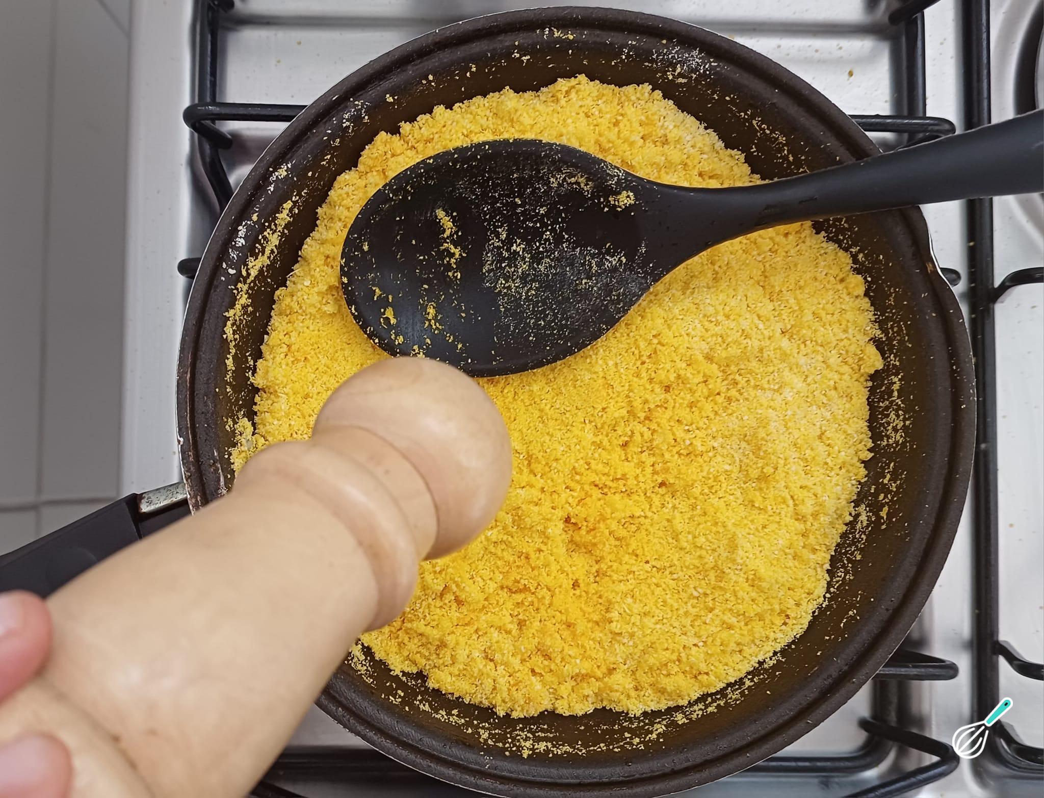 Deixe fritar alguns minutos, mexendo sempre para a farinha ficar levemente torrada, atribuindo assim mais crocância à ela.