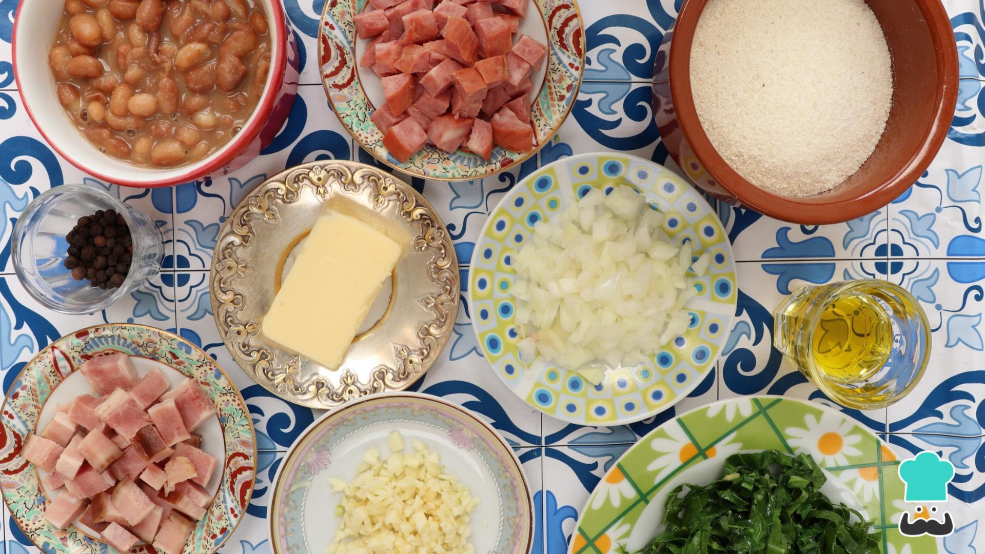 Separe os ingredientes. O feijão já tem que estar cozido então você pode tranquilamente usar aquele feijão que sobrou do almoço para fazer essa farofa. A cebola e o alho devem ser picados e o bacon e a linguiça devem ser cortados em cubos.