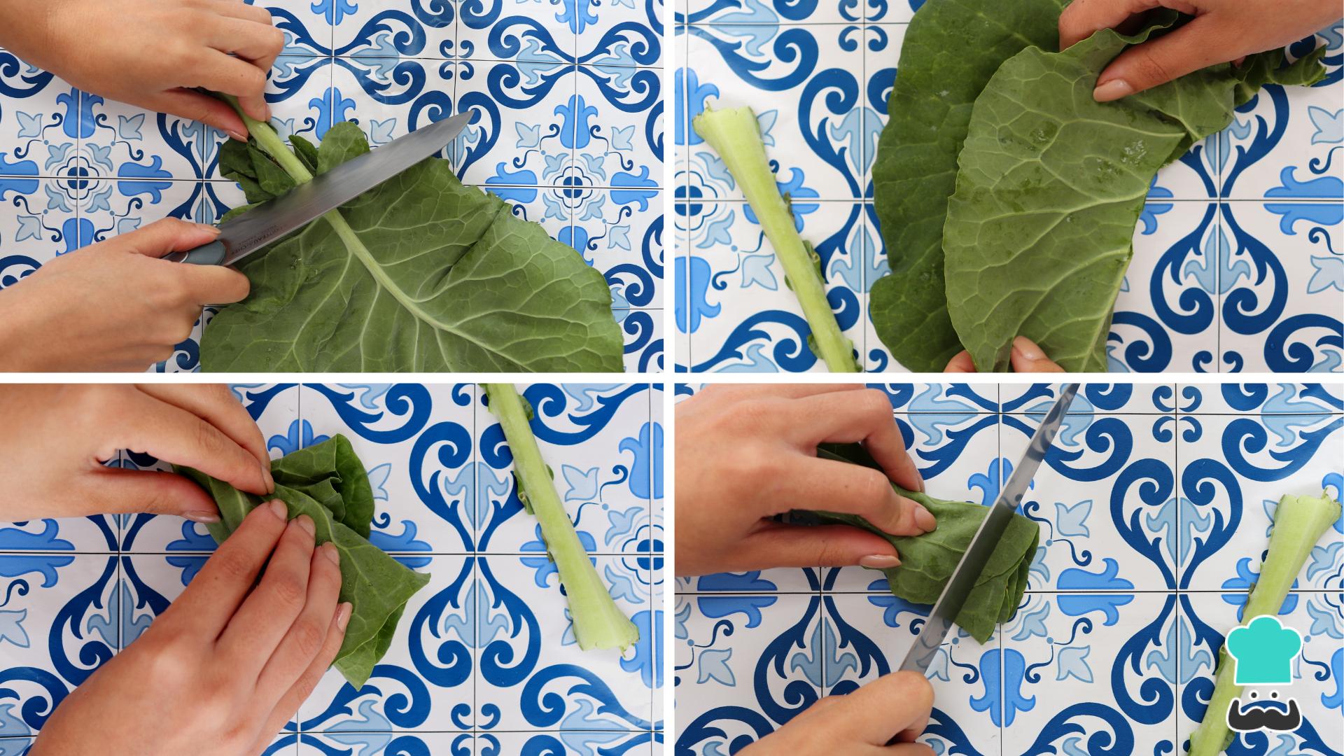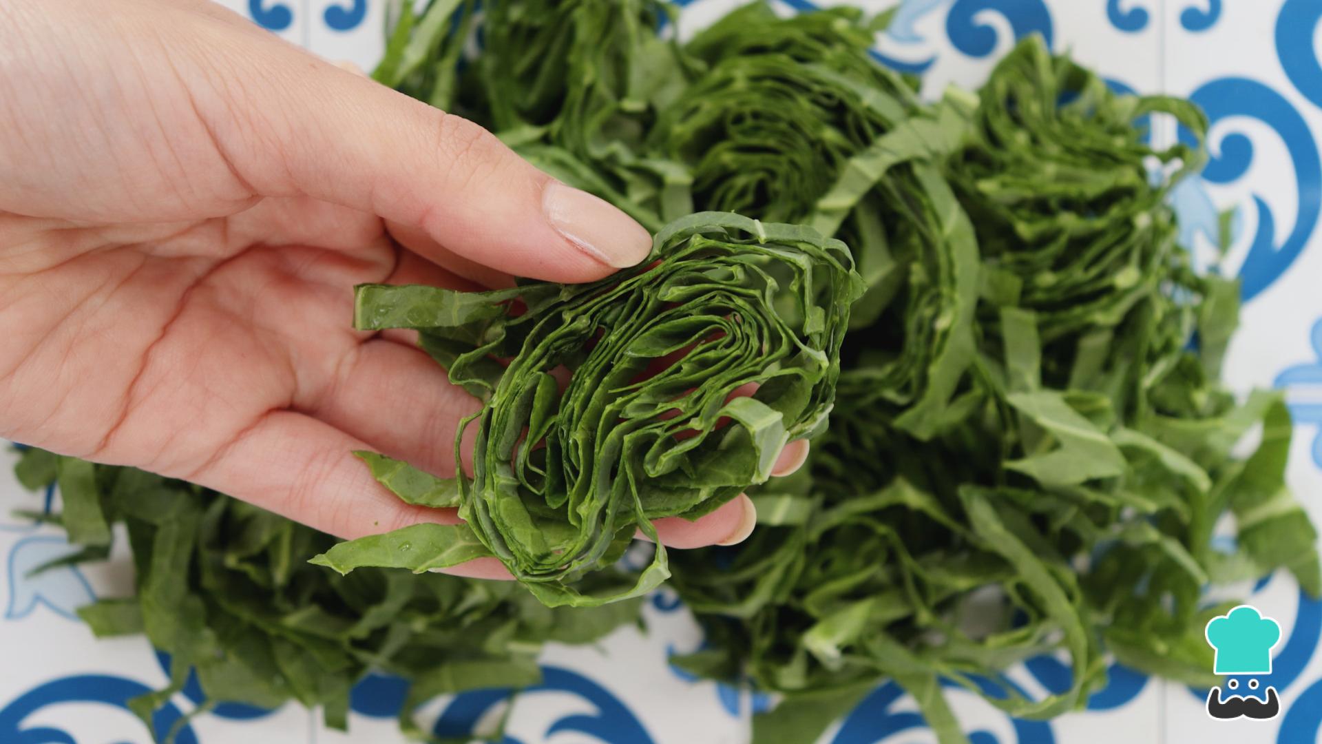 Lave bem as folhas de couve. Comece descartando o talo e dobrando a folha ao meio. Em seguida enrole como se estivesse enrolando um rocambole. Por fim corte esse rolo em tiras, assim como mostra a imagem.