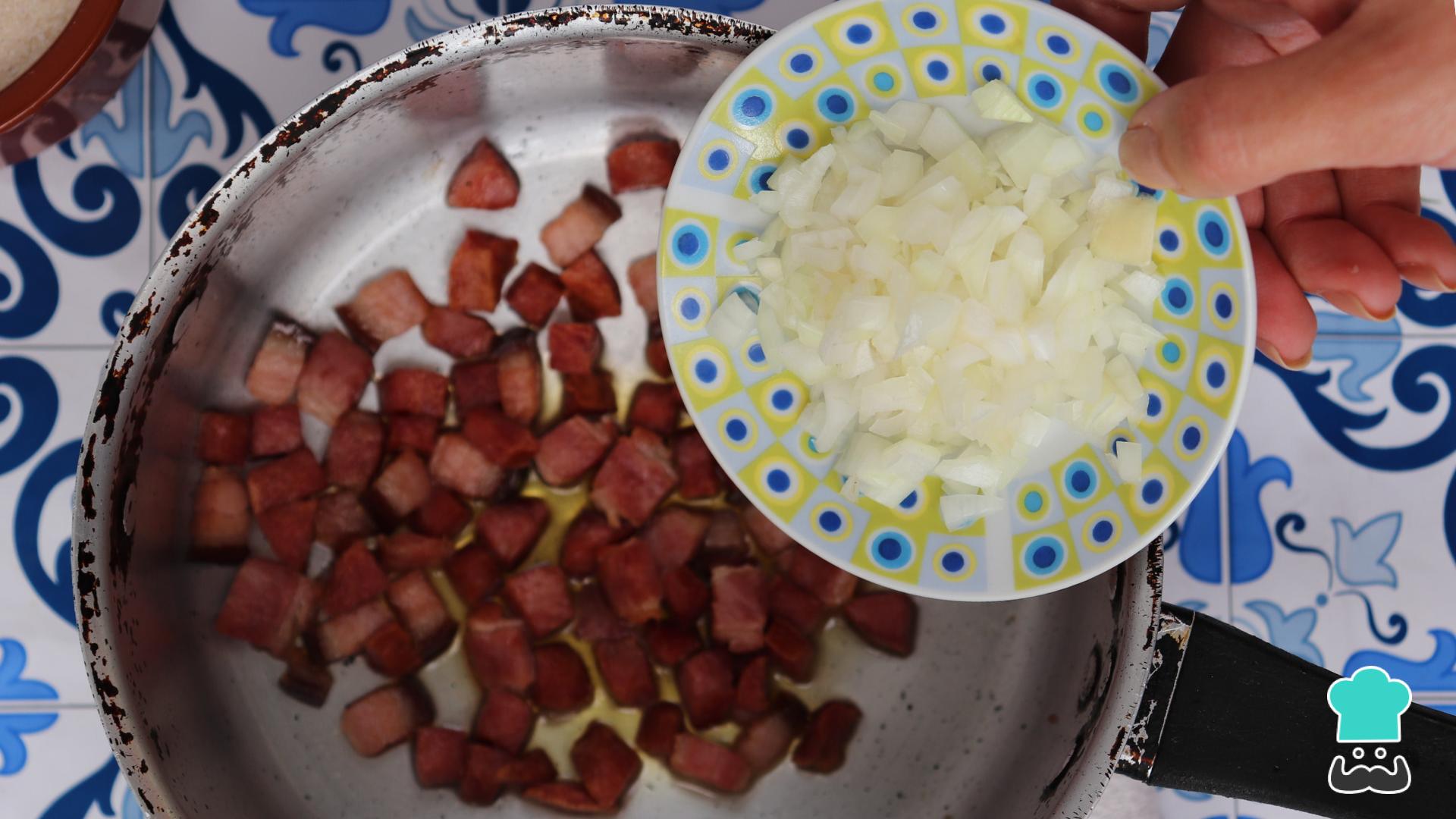 Em outra panela, refogue a linguiça e o bacon no azeite. Em seguida coloque a cebola picada e doure.