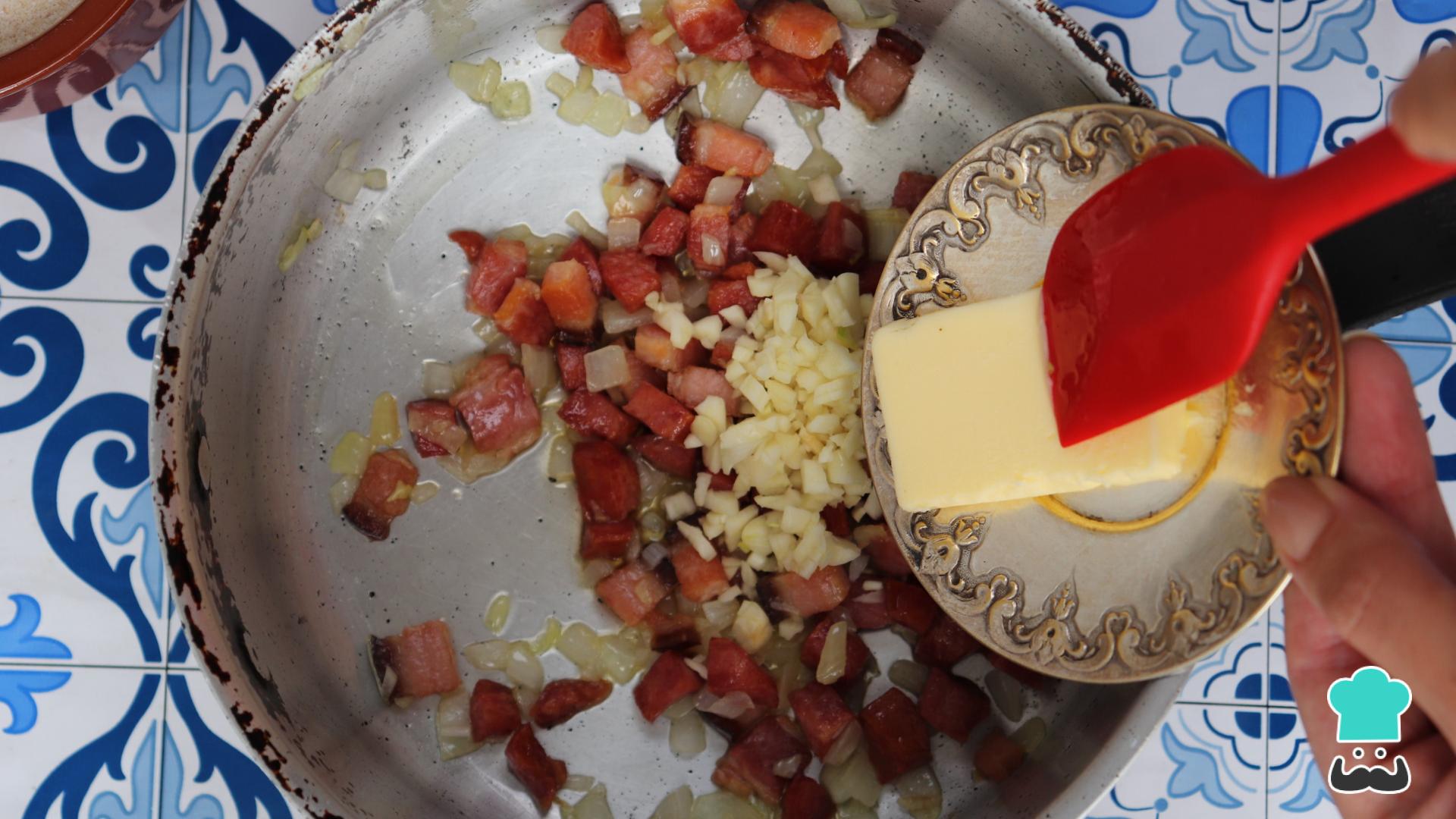 Agora acrescente o alho picado e a manteiga. Misture e deixe dourar (cuidado para não queimar!).