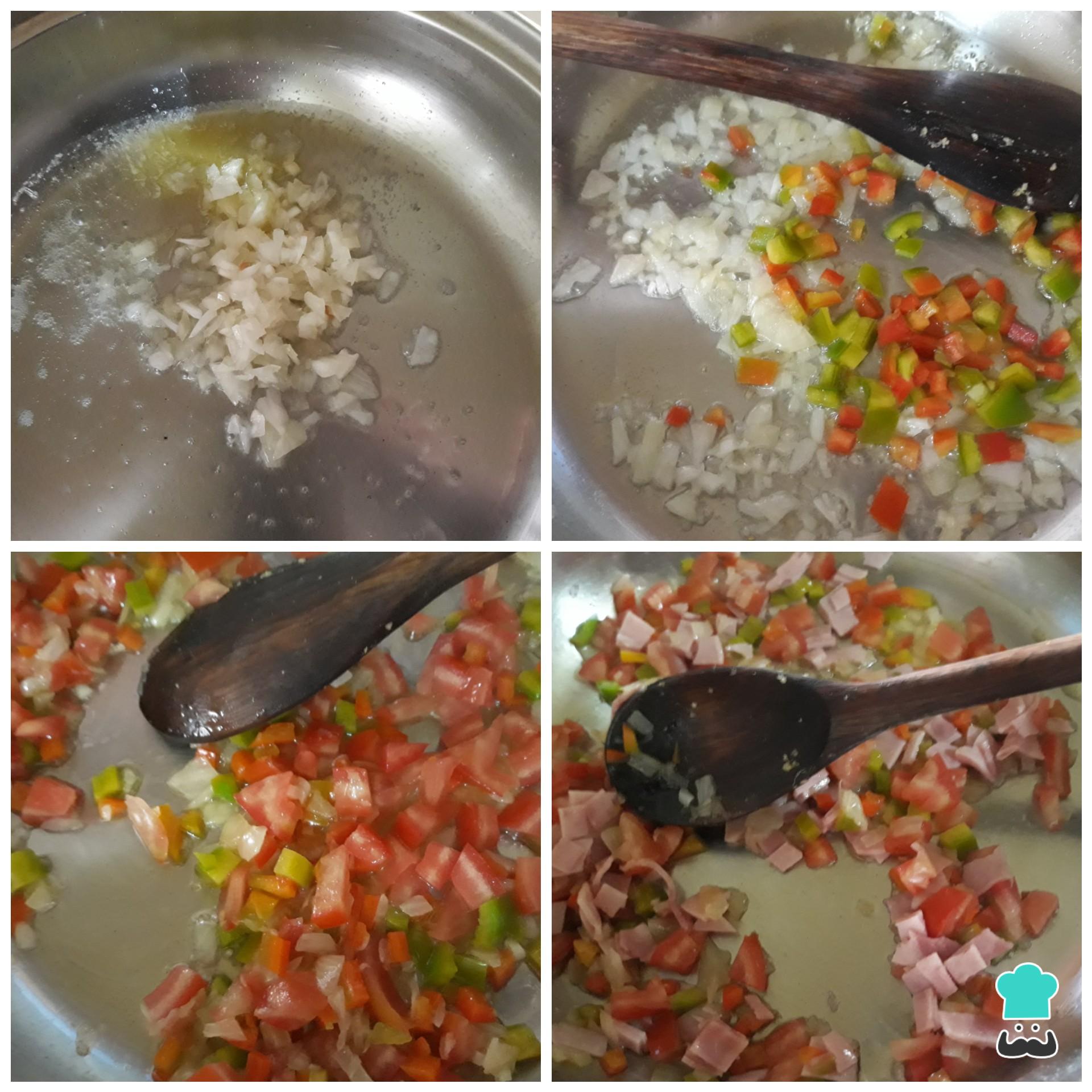 Derreta o tablete de carne na água e hidrate os flocos de milho nela. Em uma frigideira coloque o óleo e a margarina e refogue a cebola até ficar translúcida, em seguida acrescente o pimentão e refogue por mais 5 minutos. Após acrescente o tomate, refogue mais um pouco, coloque o presunto e continue mexendo.