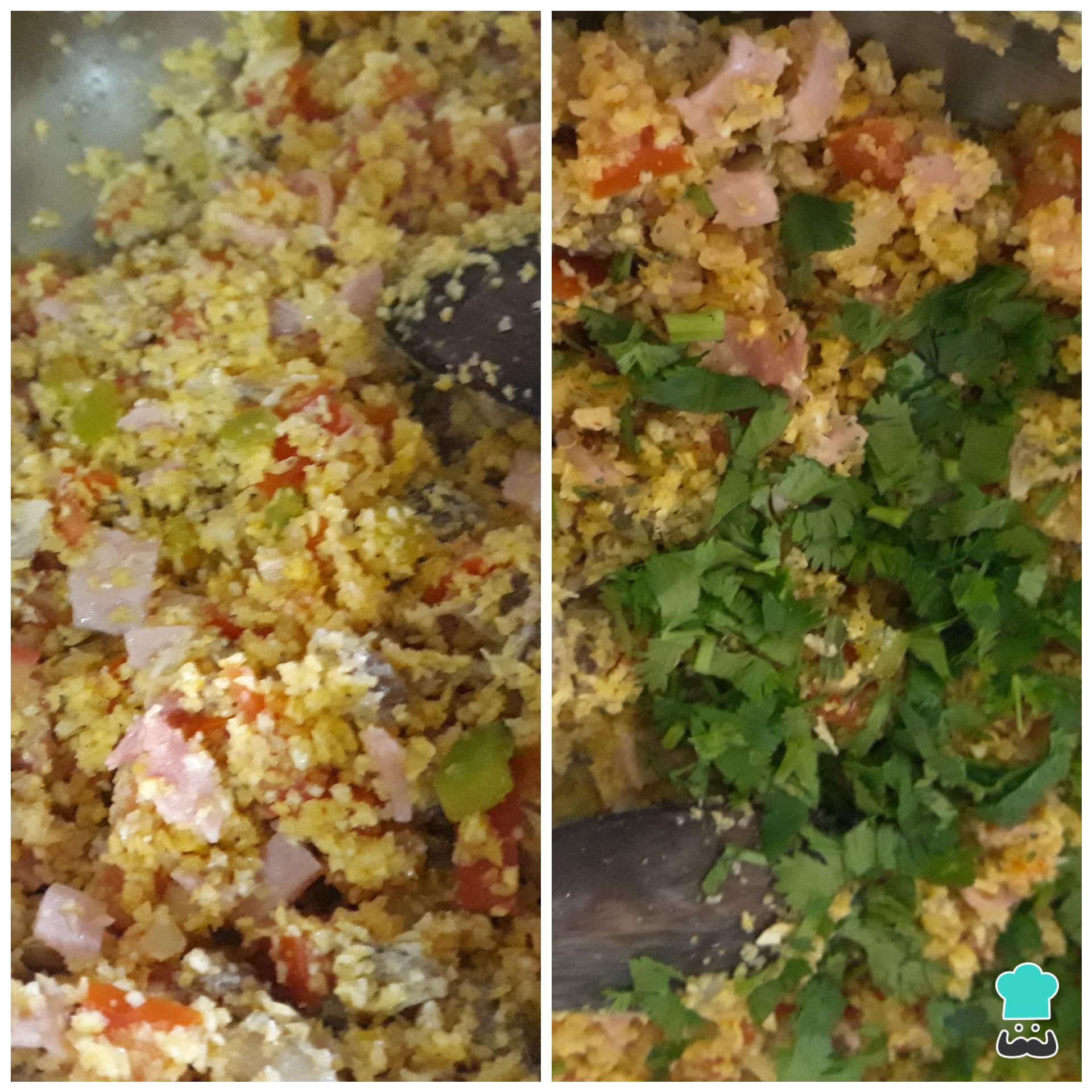O passo seguinte desta receita com flocos de milho é acrescentar os flocos hidratados e continuar mexendo. Acerte o sal e finalize com o coentro.