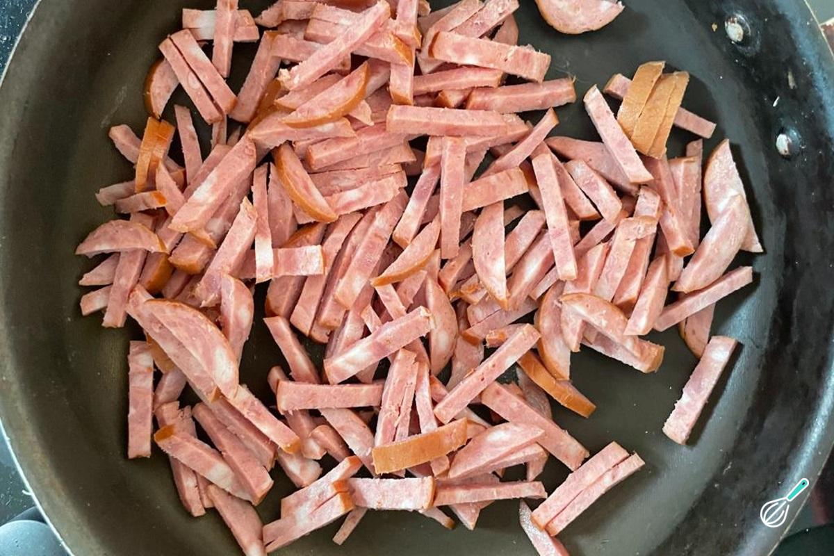 Na mesma frigideira, adicione a linguiça calabresa em tiras, refogando até dourar bem.