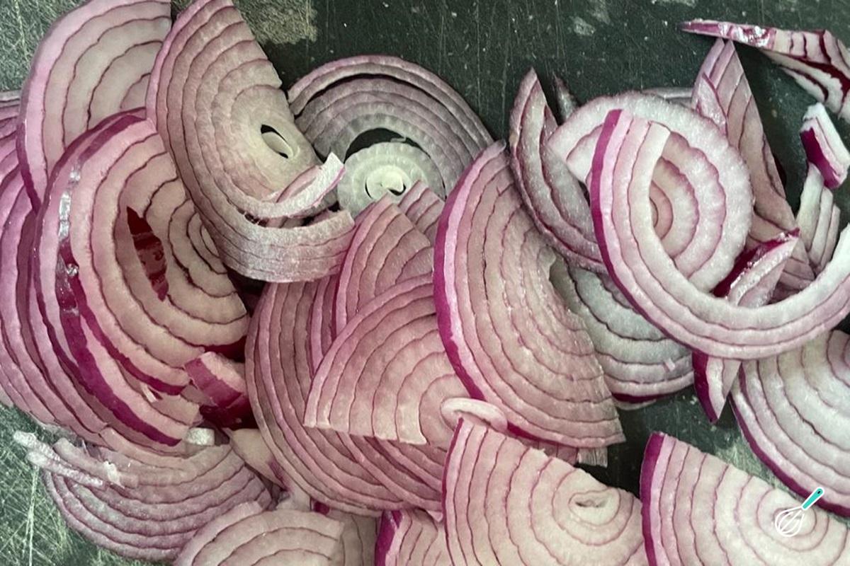 Enquanto isto, fatia a cebola roxa em meia lua.