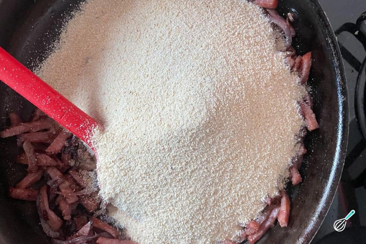 Desligue o fogo e adicione a farinha de mandioca torrada, o sal e a pimenta do reino preta moída. Misture bem.