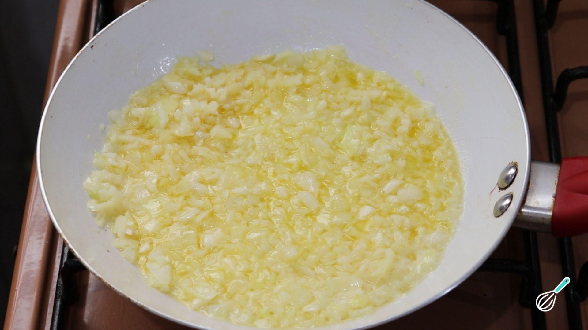 Frite o alho e a cebola picadas com cuidado para não queimar.