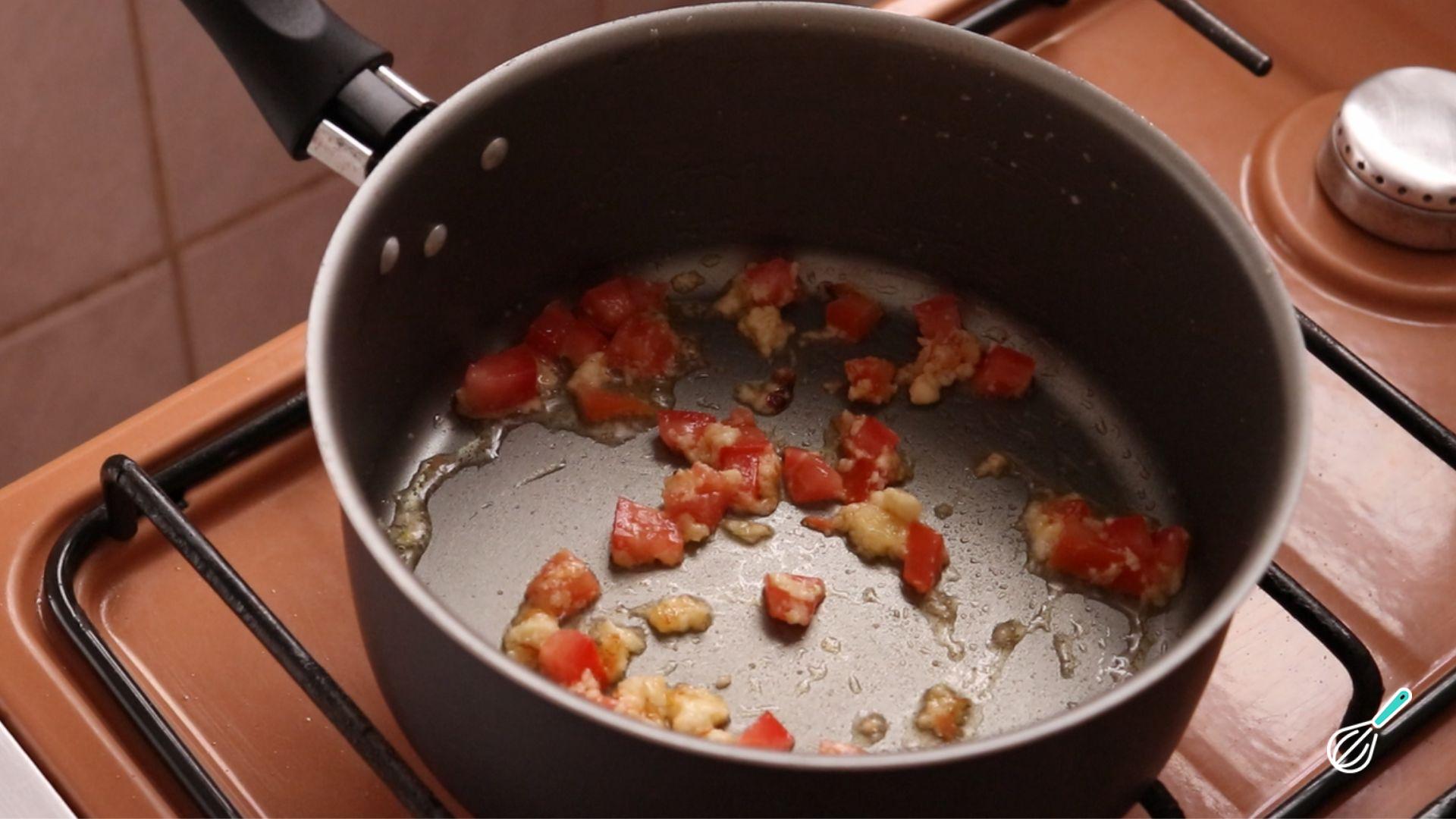 Leve uma uma panela ao fogo médio e doure o alho e a cebola no azeite. Junte o tomate e misture bem.