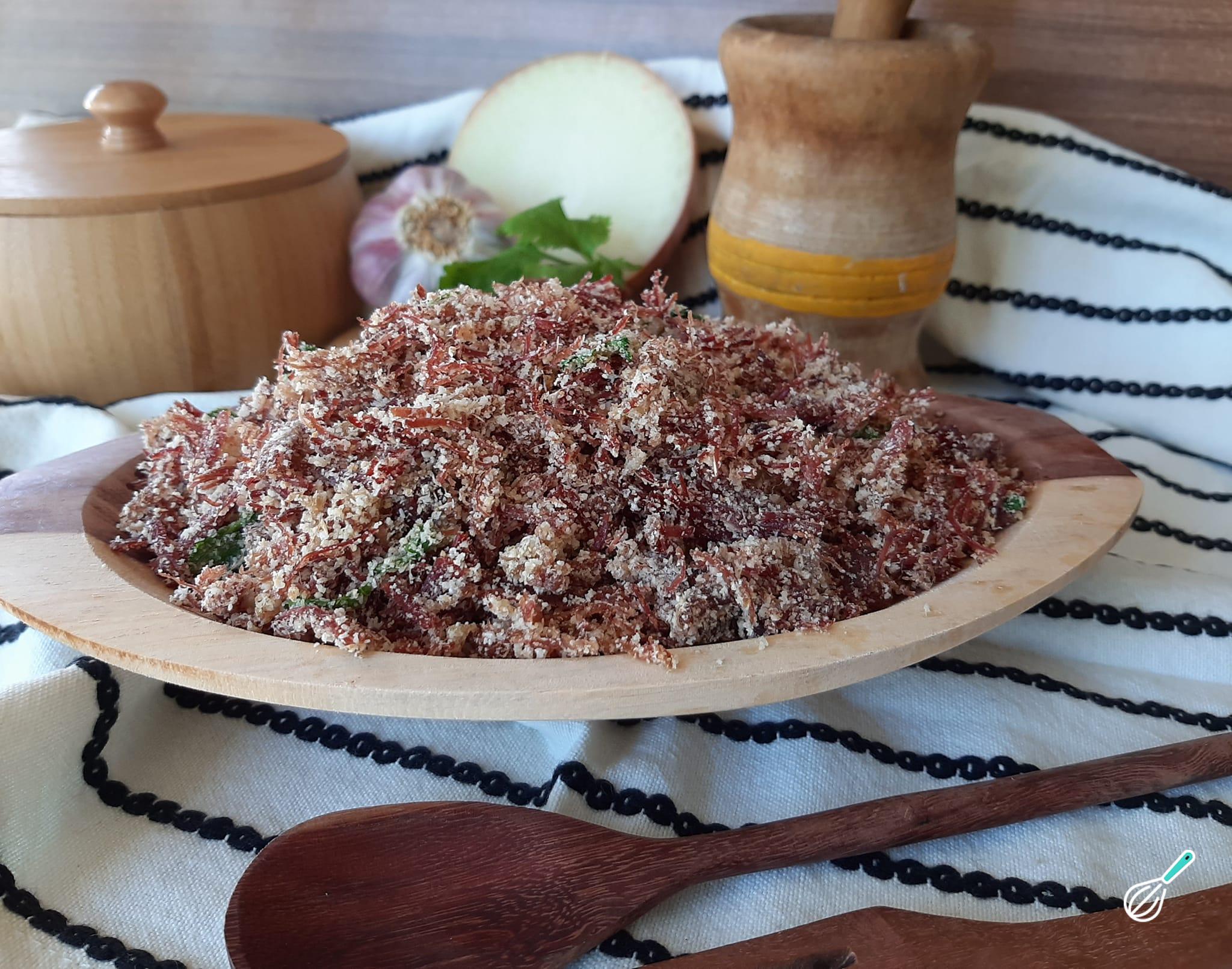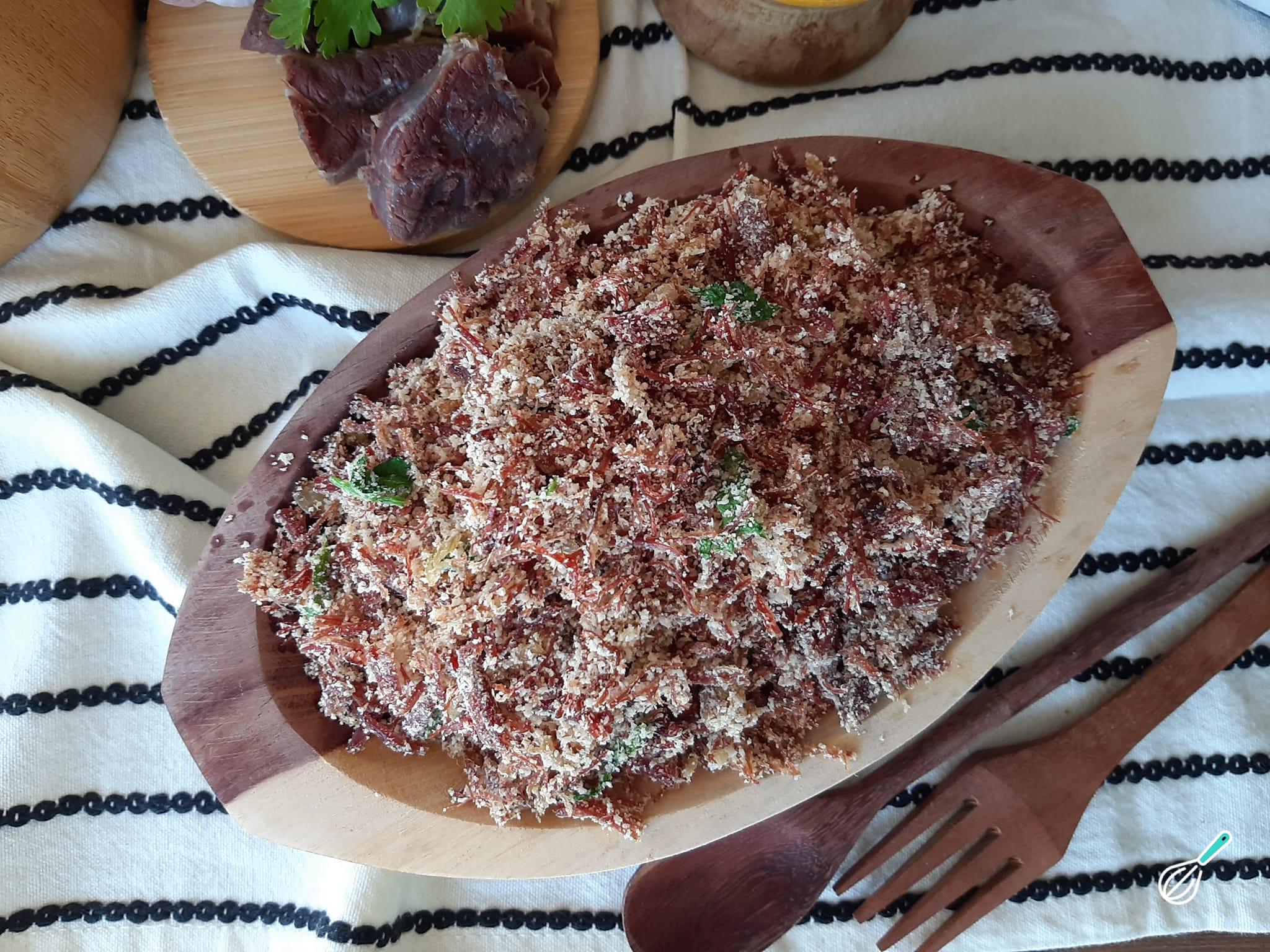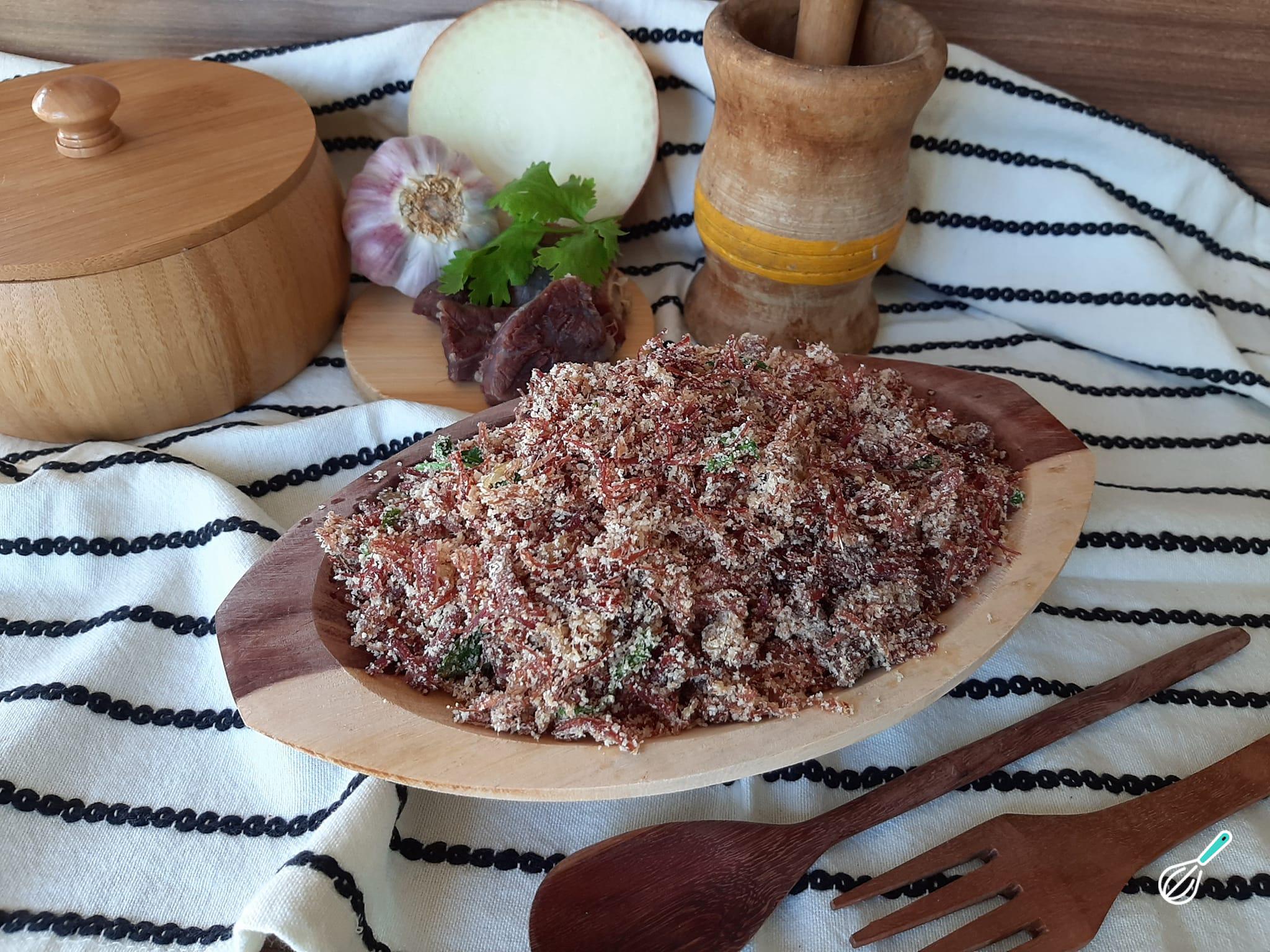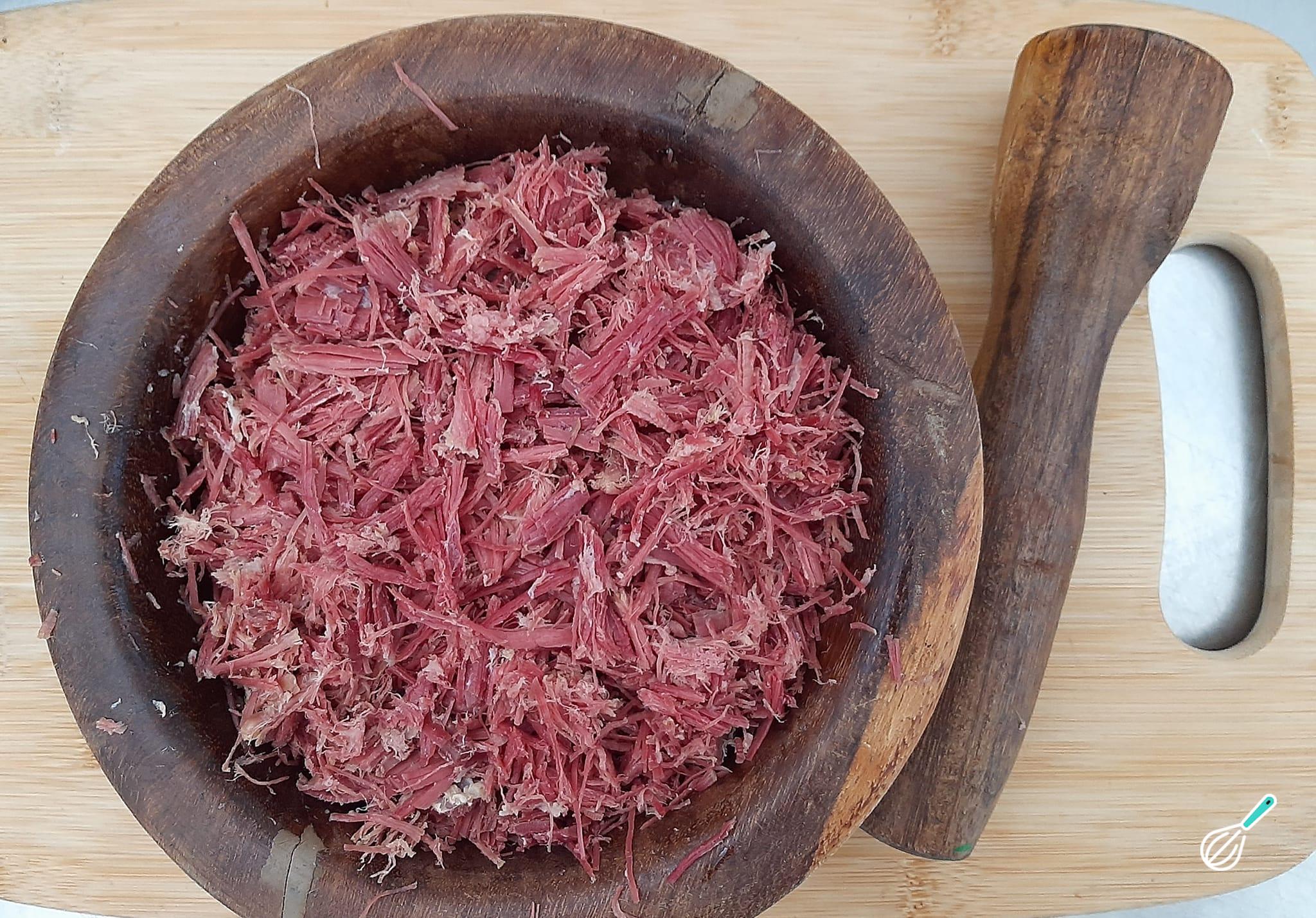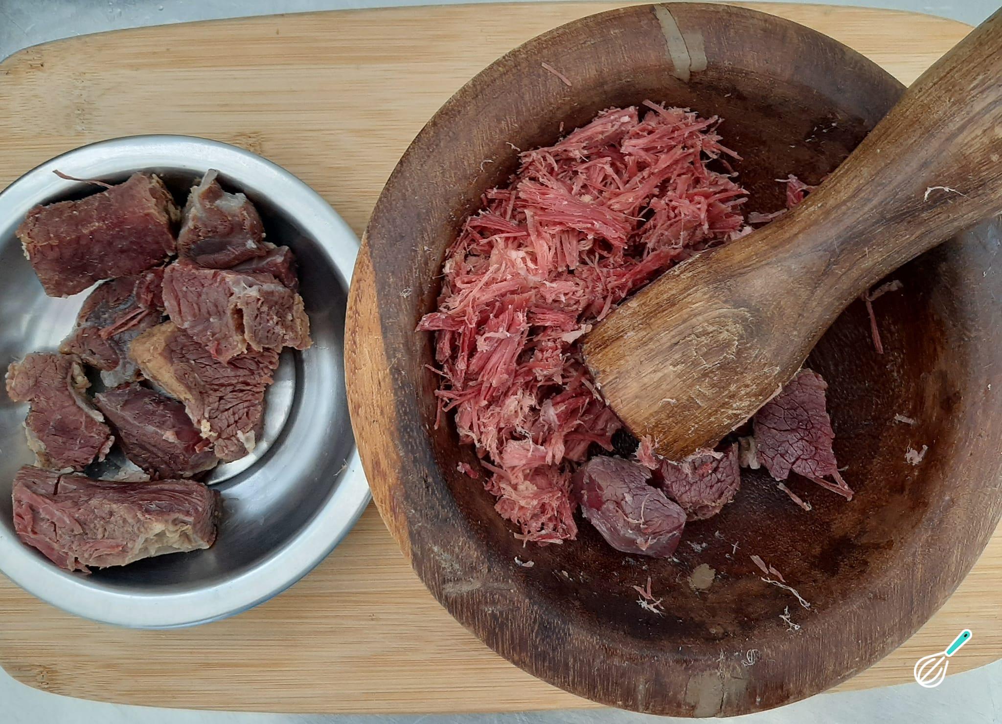 Dica: Se não quiser socar a carne no pilão, pode utilizar um processador ou desfiar com o auxílio de um garfo.
